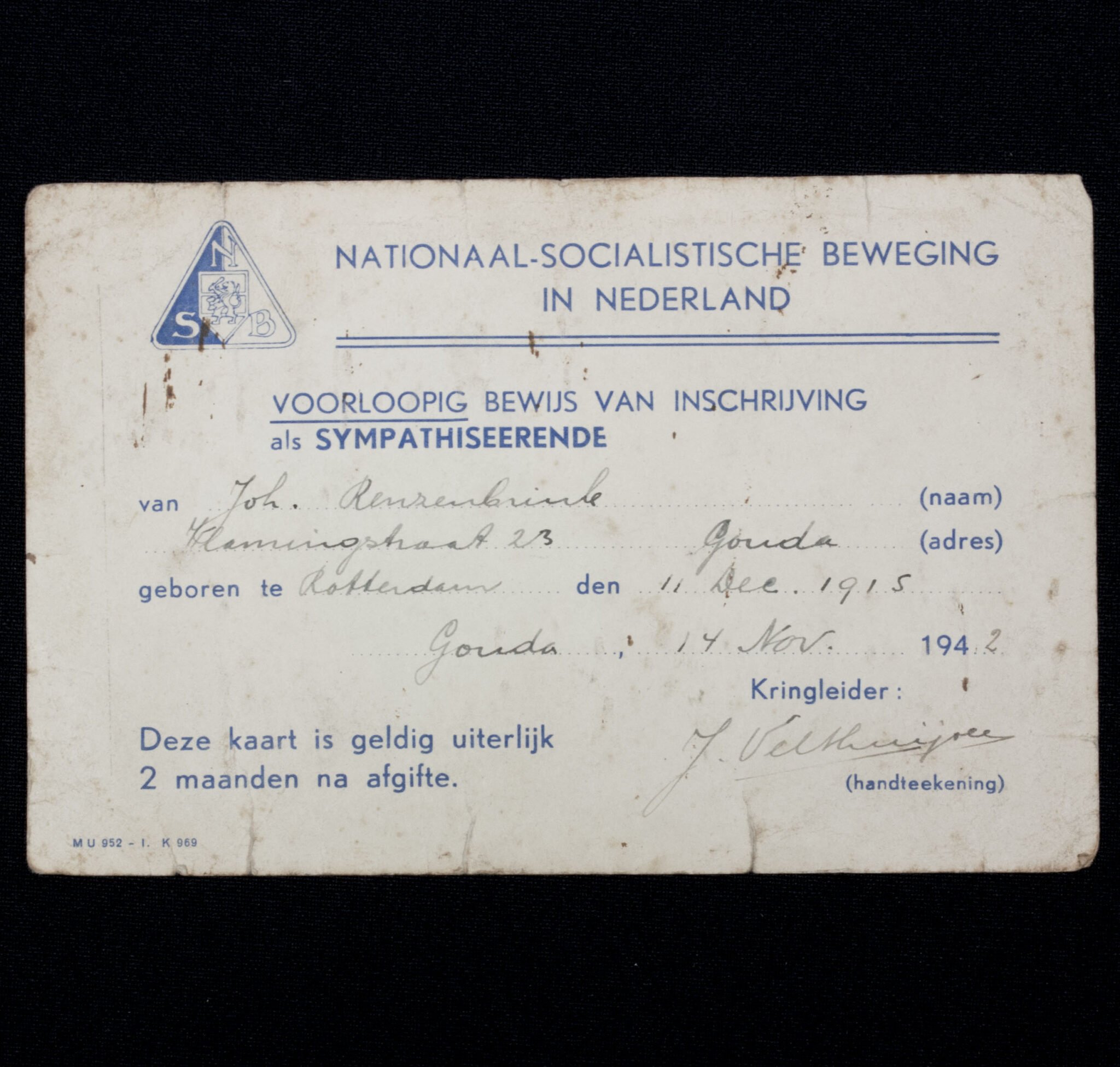 (NSB) Voorloopig bewijs van inschrijving als Sympathiseerende (Sympathisers membercard) (1942) – very rare