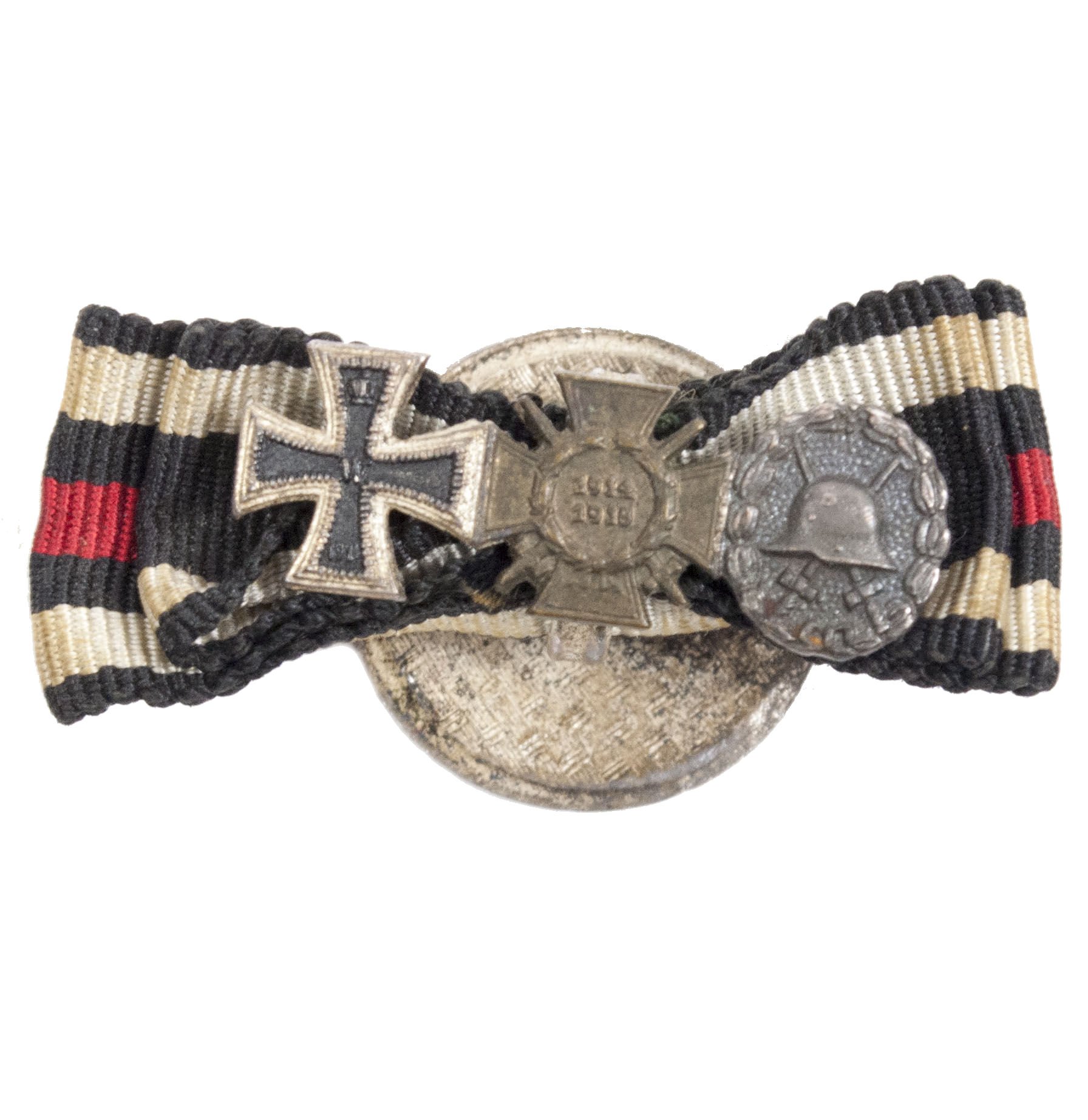 Buttonhole ribbonbar with miniature Iron Cross, Frontkämpfer Ehrenkreuz, silver Woundbadge.In good condition.