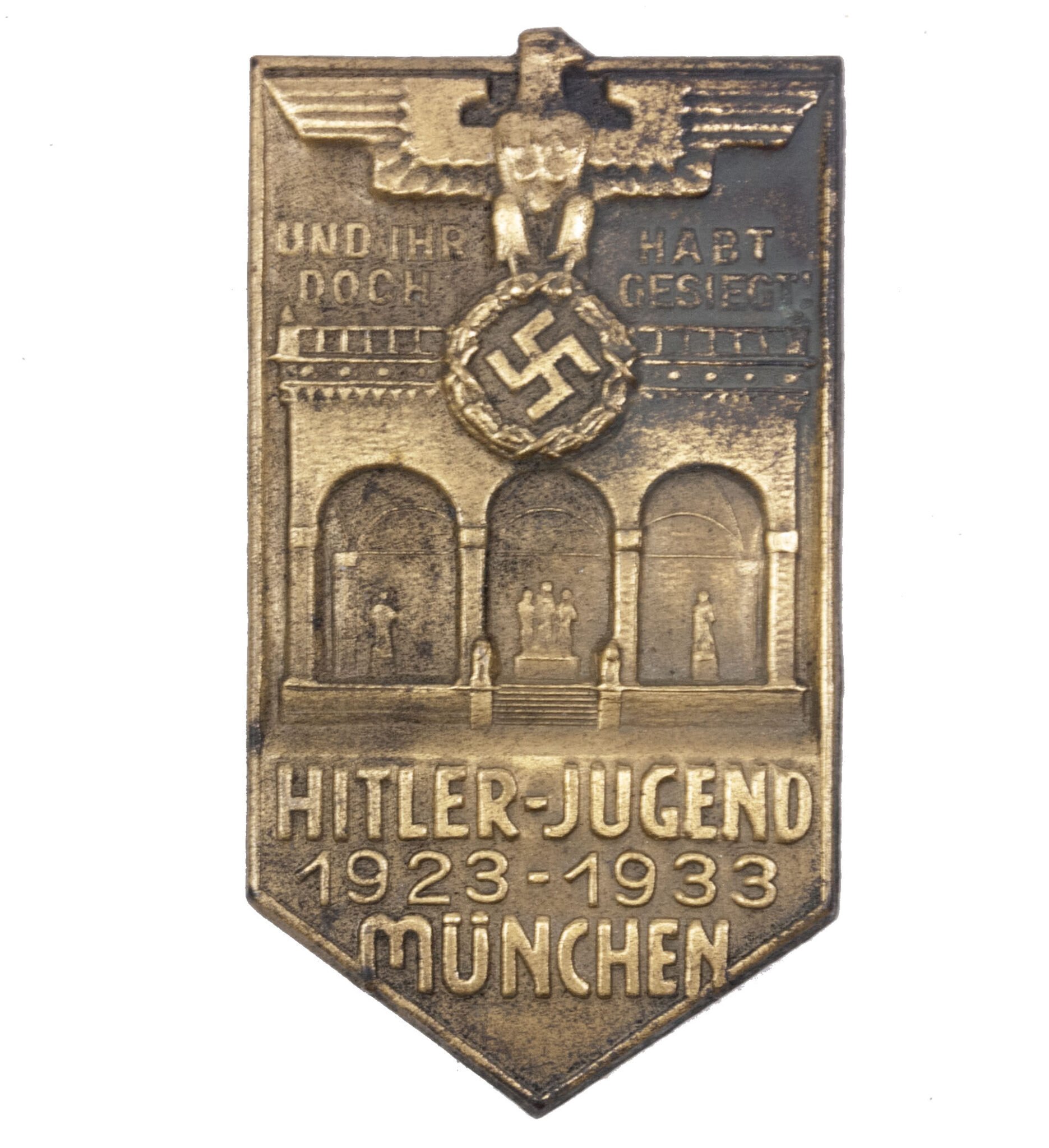 Hitlerjugend (HJ) 1923-1933 München abzeichen.Hollow variation. Pinplate maker marked H. Wittmann München.In worn/used condition.