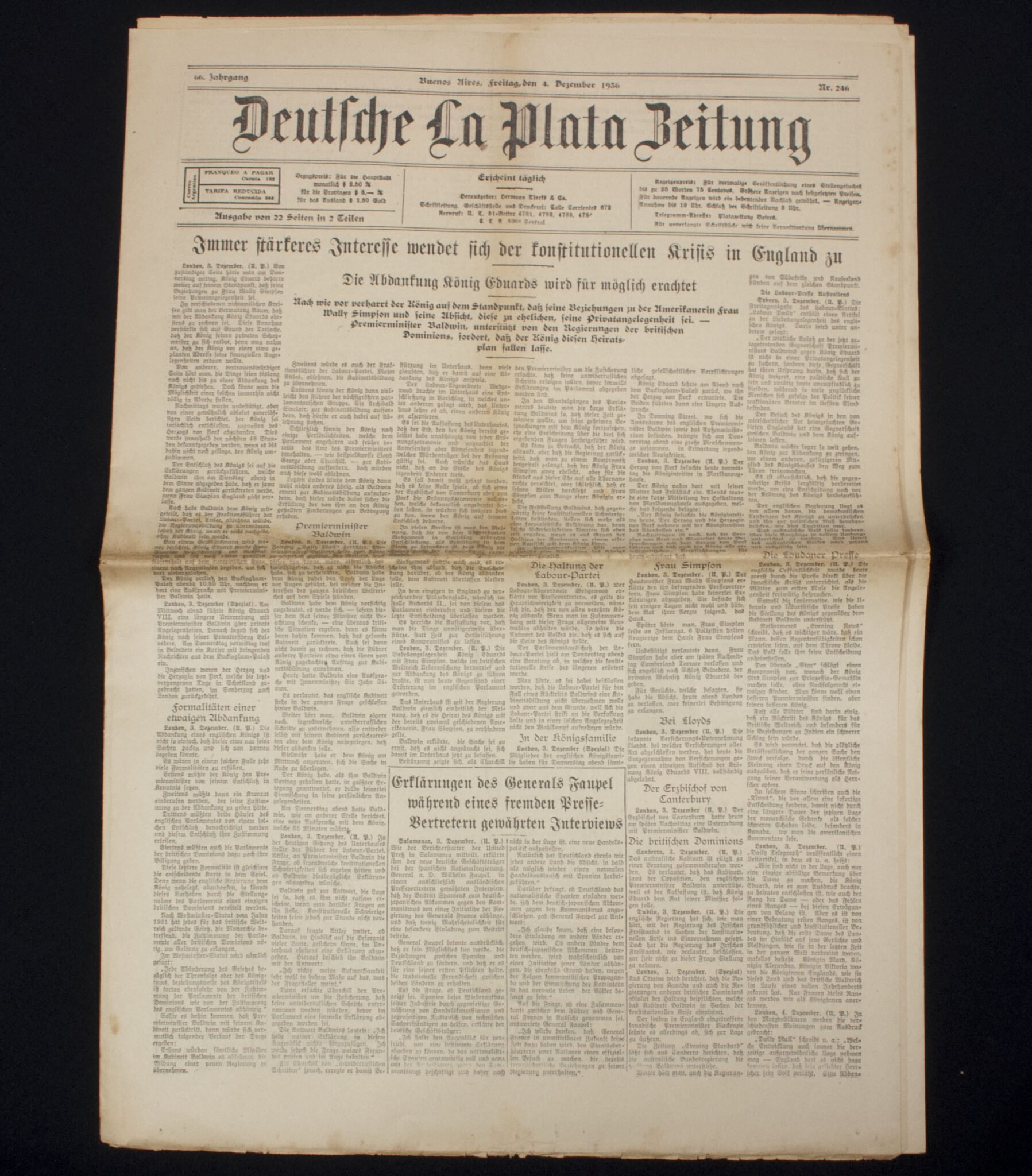 (Newspaer) Argentina β Deutsche La Plate Zeitung 4 Dezember 1936 β VERY RARE.Including the extra add on attachment papers.This was an openly pro-NSDAP newspaper for Argentina, in the years just before World War II.Very hard to find!!!More background information: https://de.wikipedia.org/wiki/Deutsche_La_Plata_Zeitung