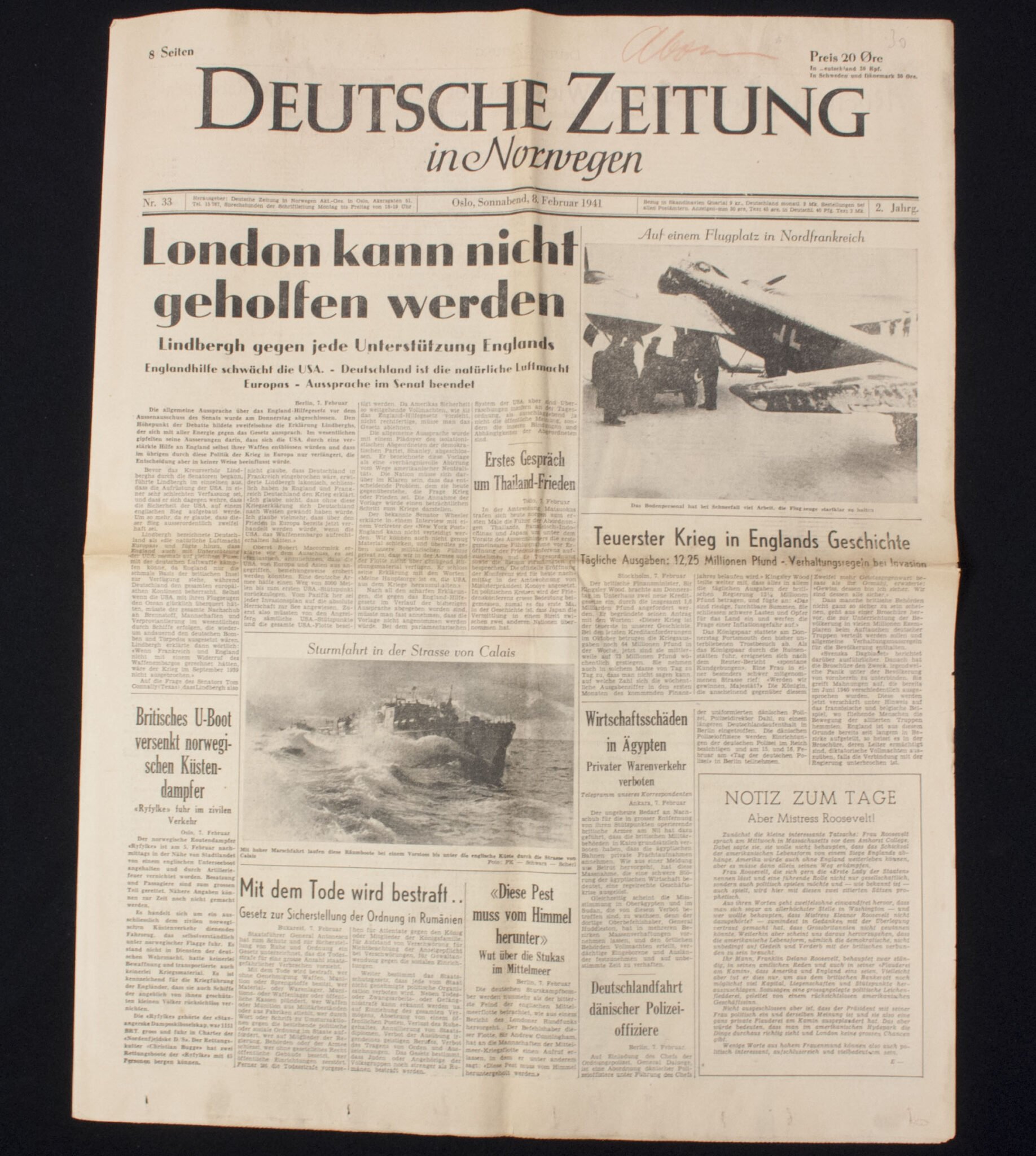 (Newspaper) Deutsche Zeitung in Norwegen 9. Februar 1941