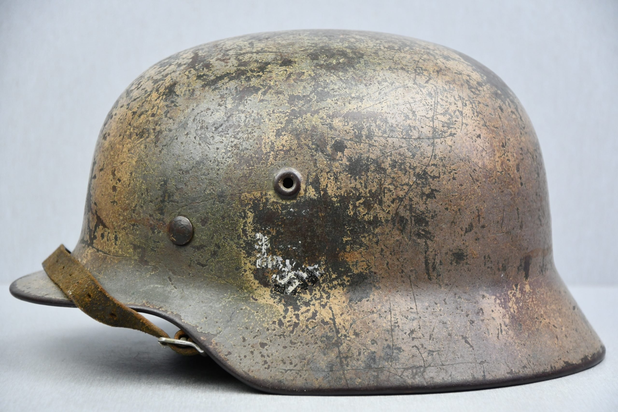 Beautiful M40 German helmet, a single decal example produced by SE (Sächsische Emaillierwerke). The shell is size 66, clearly stamped SE66, with a two-digit lot number 90, which is rather uncommon. This is a genuine single decal helmet that was wartime camouflaged in so-called Normandy colors, consisting of tan – beige, green, and reddish-brown spray paint. The camouflage is completely original and shows a very nice, authentic patina with wear consistent with field use, including typical abrasion on the top from being placed on the ground.As was often done by collectors in the 1970s–1990s, part of the camouflage paint on the left side was removed to re-expose the decal, commonly referred to as a 'dugout decal.' As a result, the camouflage on that side is damaged and only a partial decal remains visible, likely because it had already been partially worn off before the camouflage was applied. The opposite side of the helmet, however, remains very attractive, with clearly visible camouflage streaks and a well-preserved pattern.The helmet is complete with an original liner and chinstrap. The liner appears to have been replaced at some point, but it is a correct and fully original example in excellent condition, made of soft leather with the original drawstring still present. The chinstrap is also original, full length, with an aluminum buckle and marked Leonh. Beck, Nürnberg, dated 1940. The chinstrap alone represents significant value. Overall, this is a very appealing and honest camouflage helmet with character, and despite some imperfections, it remains a highly collectible piece.