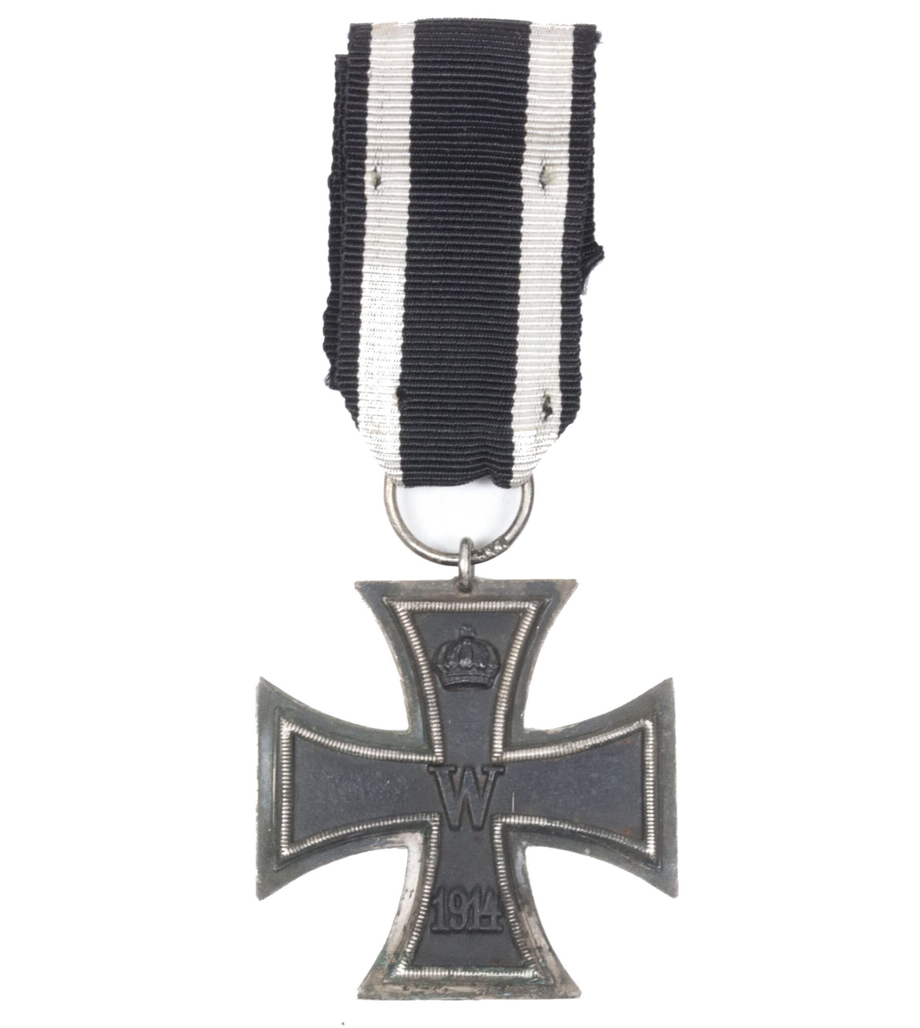 WWI Eisernes Kreuz Zweite Klasse (EK2) / Iron Cross second Class.In the ring maker marked with makerscode 'KAG'. The ribbon shows the remains (!) of where once was a clasp attached!!!In good but used/worn condition. Great for on a worn tunic.