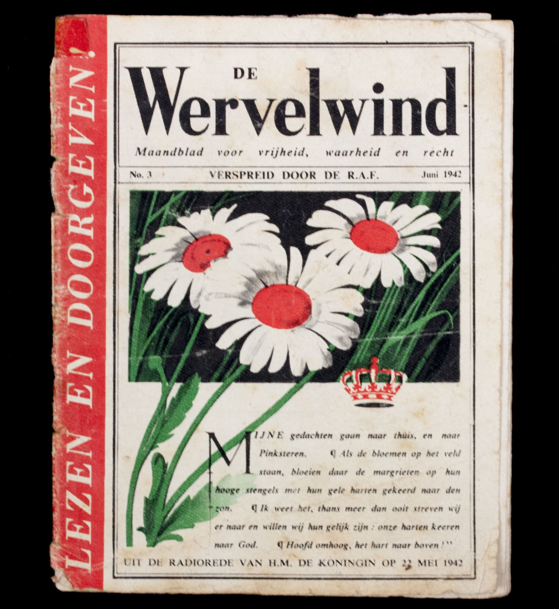 (Resistence Magazine) De Wervelwind Maandblad voor vrijheid, waarheid en recht. No.3Spread and dropped by RAF airplane in 1942 over the Netherlands. Bookblock loose from the spine. Remember these were thrown from airplanes, all have somewhat of damage.In good condition.