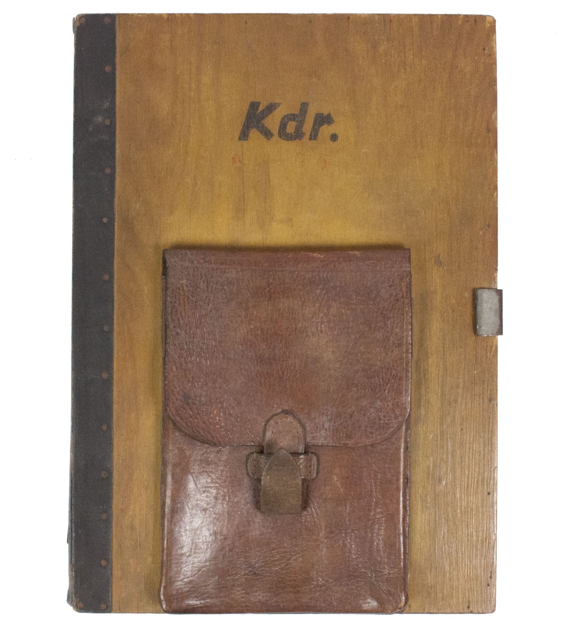 This is a wooden officers map plotting board. These were used by officers in t e field and throughout the whole Second World War on all front, to make notes or draw on maps in the field. It is made of wood and has when openend both on the left and right side the original celluloid intertior straps present. On the right side is metallic closing device. Ont he front is a brown leather 'normal' map case affixed. On top is written in black 'KDR' (Kommandeur -> designation for a commander from division down to battalion).The map is stamped on the inside with: Panzer-Brigade 107 KDR.Panzerbrigade 107 was founded on July 28, 1944 at Milau training ground in Wehrkreis I from the remains of the 25th Panzergrenadier Division destroyed at Heeresgruppe Mitte. The vast majority of personnel came from replacement units. The Panzerabteilung 2107 was created from the remains of Panzerabteilung 125 and Reserve-Panzerabteilung 8, among others. The Staff of the brigade and the Panzergrenadier battalion 2107 were created from remnants of the 25th Panzergrenadier Division.The German Panzerbrigade 107 was a German Panzerbrigade of the Wehrmacht during World War II. The brigade wasonly deployedin the Peel in the autumn of 1944,during Operation Market Garden and the Battle of Overloon.More background and information on this unit can be found on: https://nl.wikipedia.org/wiki/Panzerbrigade_107Even better is that there is in pencil and Sütterlin handwritting, written a name on the lower righ interior. It reads:Leutnant Gortz, Fulda, [… …].There is an unknown grave attributed to a Gortz on the Find-a-grave website for the Ysselsteyn cemetary:https://nl.findagrave.com/memorial/158806652/g%C3%B6rtzThis Gortz died on 31 oktober 1944, which fits in with the period the Panzerbrigade 107 was fighting in the area. However, more research needs to be done as there is not much information on this Gortz. The name is not a very common one and this is the only one that could possibly be the owner. A reason for thinking this is the right Gortz, is that only a handfull of members of the Panzerbrigade 107 ultimately survived the attacks in the Netherlands and it seems unlikely that this Gortz survived the battles.Inside the wooden map is a cardboard folder, containing a number of maps of:LeningradAlenconLes PieuzRostowNorrköpingRussland/Leningrad (Truppenausgabe)Russische Beutekarte (on the back of the above card)Stadtplan von DouaiNantesA very rare item related to the war in the south of the Netherlands. The condition is used, but not abused, firmly made, opens and closes correct.More on the unit's history and actions:From September 15, 1944, the brigade, although intended for the Eastern Front, was moved by rail to OB West. The brigade was to be deployed in the counterattack of the 5th Panzer Army in the area around Épinal. However, the brigade was diverted to Venlo-Roermond. There the brigade with its main parts was unloaded on the evening of September 18, 1944 and on September 19 the unloading was completed. That same day, the brigade marched under constant air attacks across the Maas to the Zuid-Willemsvaart. The reason was an attack order from the 86th Army Corps dated September 18, 1944. This was contrary to the promise to deploy the brigade in its entirety.The brigade moved to Son via Helmond and attacked the right flank of the British 2nd Army advancing towards Nijmegen and Arnhem. All attacks in the autumn of 1944 were aimed at this long right flank. The British tried to replace the bridge over the Wilhelmina Canal, which had been blown up by German troops, with a war bridge. The brigade attempted to reach this bridge on September 19, but was unsuccessful. However, the brigade did manage to keep the bridge and road under fire, delaying the British advance. On September 20, 1944, under pressure from American counter-attacks, the brigade had to give up its hold on Son and divert 3 kilometers to the east, to Nuenen. Due to lack of fuel, some tanks had to be blown up.On the evening of September 21, 1944, the brigade was ordered to move to Bakel. She was to take part in an attack by Kampfgruppe Walther. In addition to the brigade, this included an SS ad hoc infantry battalion, a replacement battalion, an artillery abteilung and an anti-aircraft abteilung. Kampfgruppe Walther's task was to interrupt the British advance route from Eindhoven to Nijmegen at Veghel on the Zuid-Willemsvaart, thus establishing a link with the German 59th Infantry Division, which was attacking from the west. This would cut through the British corridor. The operation was similar to that of the brigade against the bridge of Son, but now the losses were much greater. In foggy weather, the attack of the Kampfgruppe with the brigade followed on the morning of September 22, 1944 to the southern edge of Veghel. There the attack stalled under deadly enemy anti-tank and artillery fire. Once again the brigade had the objective in sight, controlled the advance of the British 2nd Army and forced it to regroup its troops. It slowed down the British advance, but failed to stop it.The brigade attacked twice more. The first time in the night of September 22 to 23, the second time on September 23. The attacks repeatedly bogged down on the strengthening Allies, with great losses of men and material. The commander of the Panzerabteilung 2107, Major von Plüskow, fell in battle. After the third attack, the enemy launched a tank counterattack. The commander of Panzergrenadier Battalion 2107, Captain Wild was also killed. Finally, on the afternoon of 23 September, the brigade was forced to go on the defensive. New airborne landings reinforced the Allies and forced the brigade to withdraw 6 to 10 kilometers to the southeast in the evening and defended itself there against the pursuing enemy on 24 September 1944.Due to the losses on 23 September 1944, the brigade was so weakened that it did not undertake any further activities to interrupt the British advance. The b