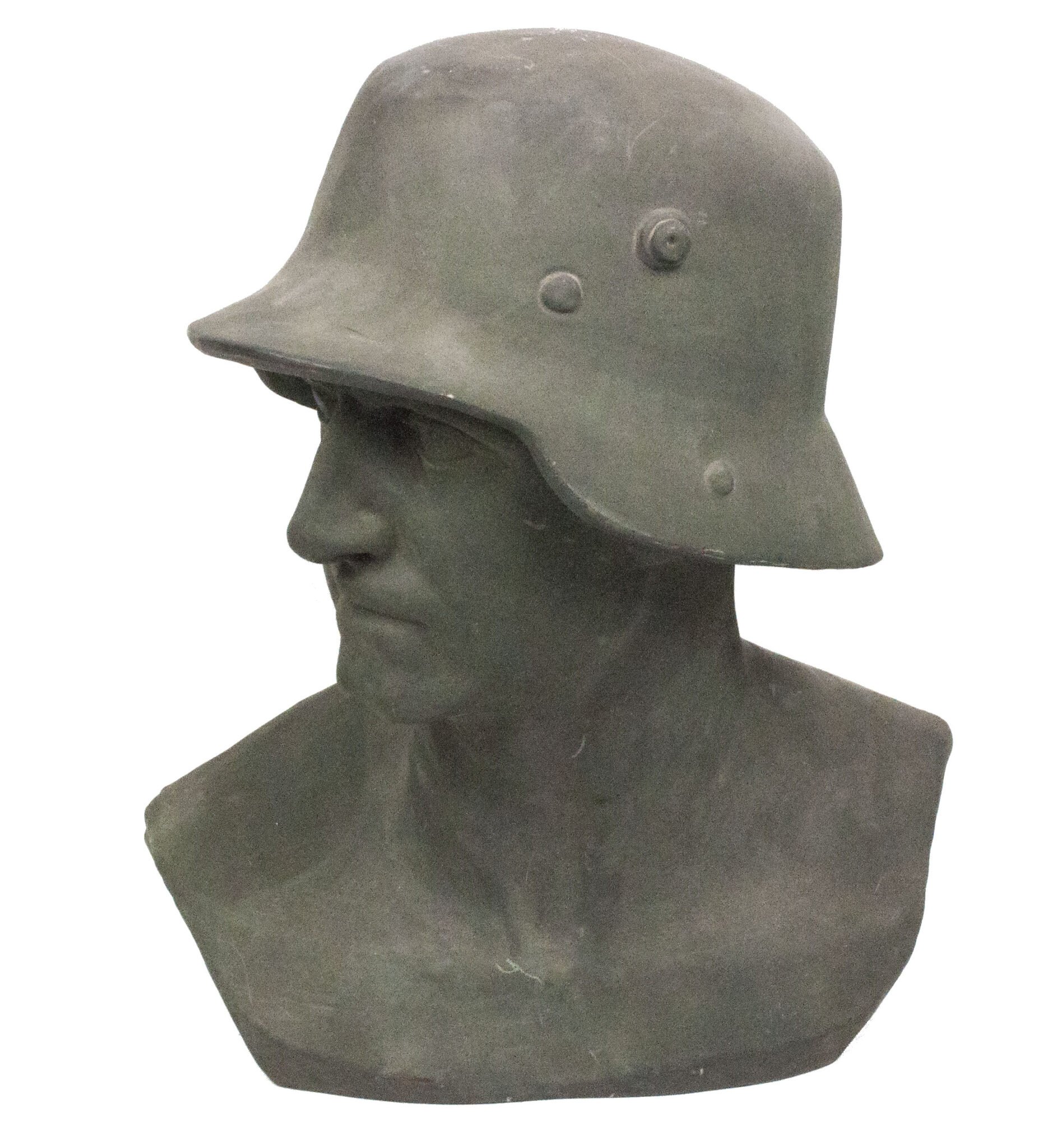 This is a German World War I frontsoldier bust in very large size.It is approximately 57 centimet4ers high and over 20 kilo's.Made of Galvanoplastic, a metalic chemical method for forming metal parts that exactly reproduce a model (https://en.wikipedia.org/wiki/Electrotyping).The bust is hollow and on the lower end filled with plater, It is overall coated in a dark green paint.Due to it's size very impressive and the largest bust i've ever encountered. This would make an amazing (museum) display in any collection.Please note: It is too large and heavy for shipment. Pickup after appointment only in the Netherlands!