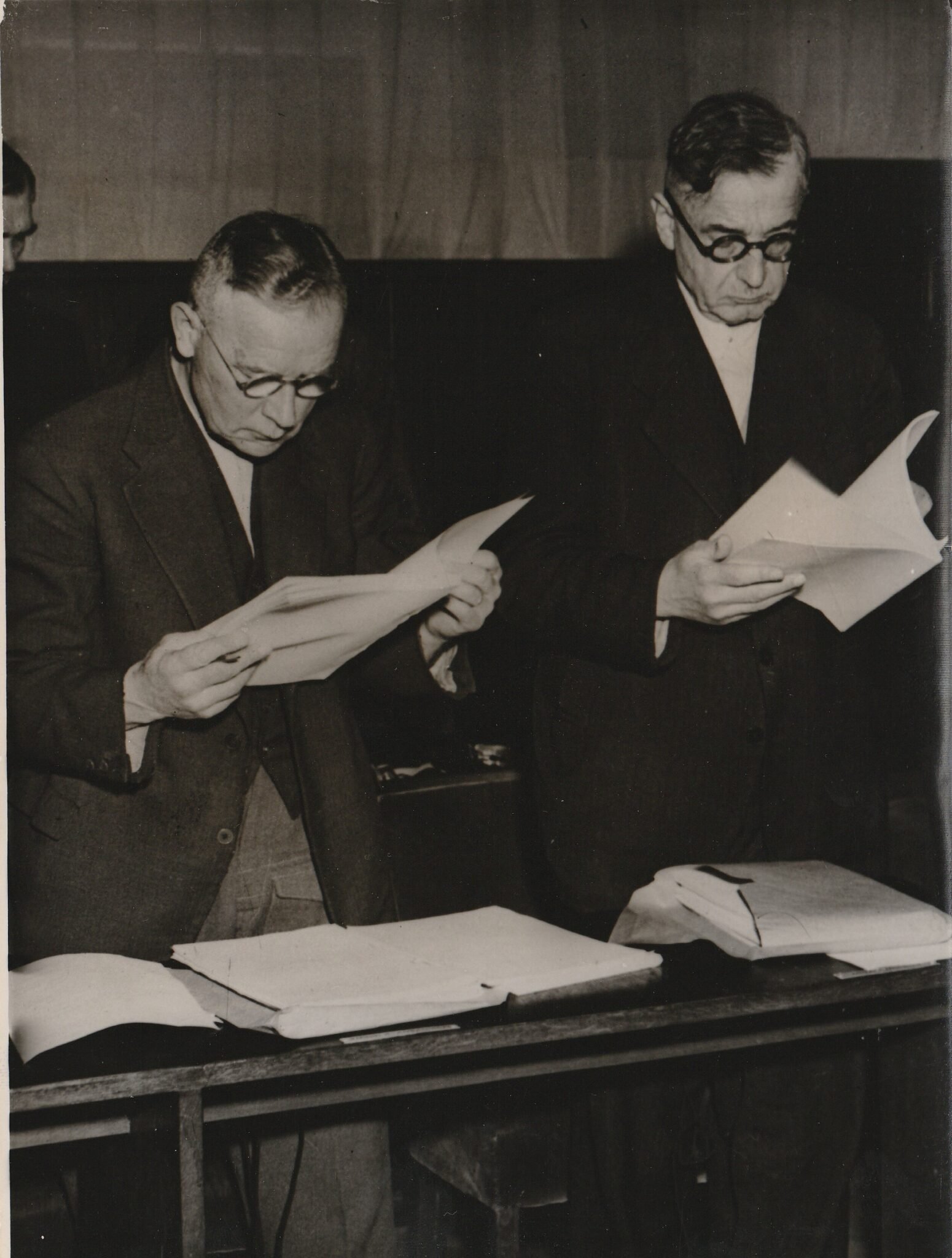 (Pressphoto) Nuremberg Trials – Farben Industrie Chiefs recieve indictmentsAssociated Press.1945/1946.Approximately 20,5 x 15,5 centimeters.Original period pressphoto.