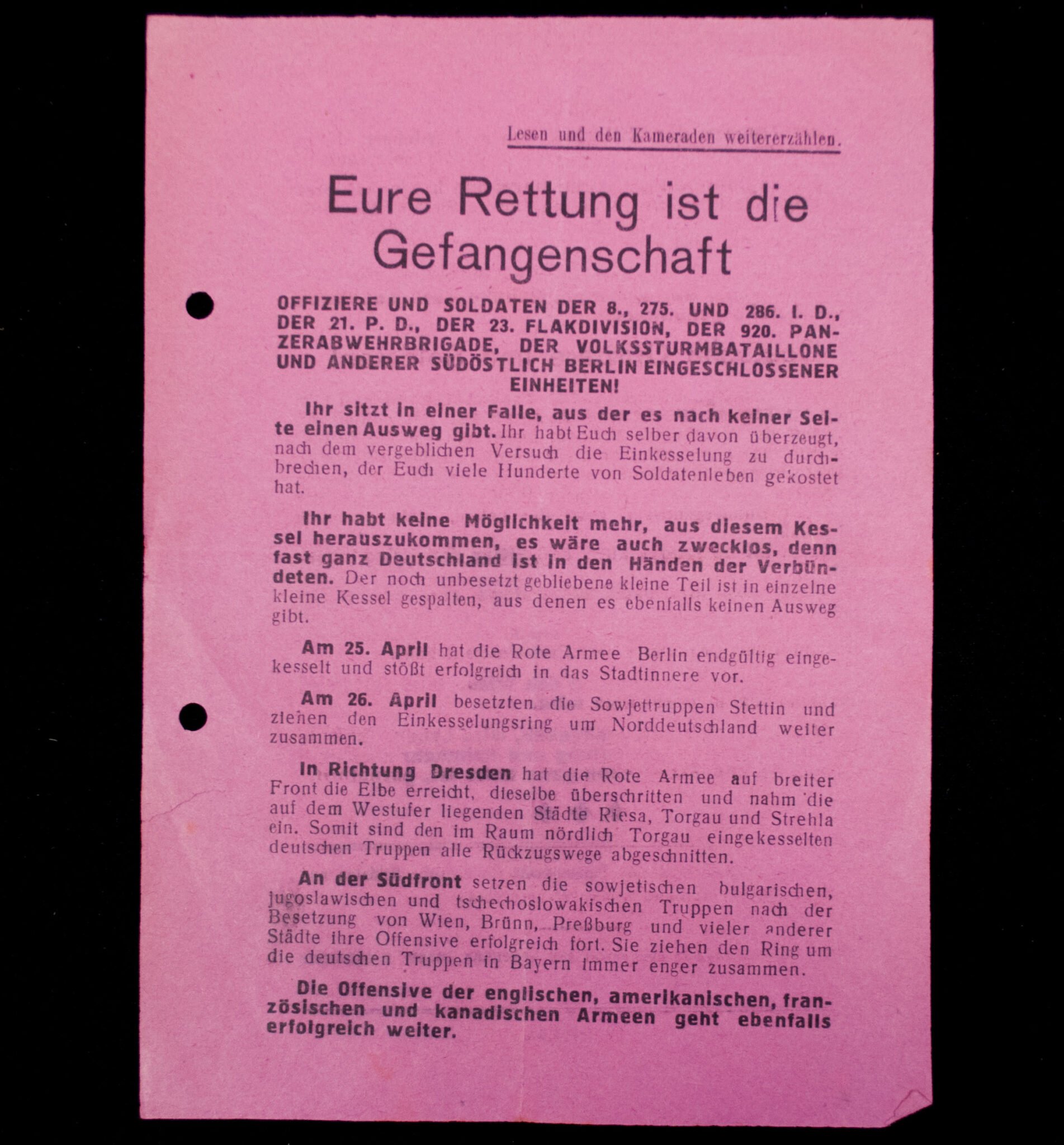(Pamphlet) Russian anti-German propaganda 'Eure Rettung ist die Gefangenschaft' (27 April 1945).Extrmely late war Russian anti-German propaganda, calling for surrender of German troops.Very hard to find.In good condition.