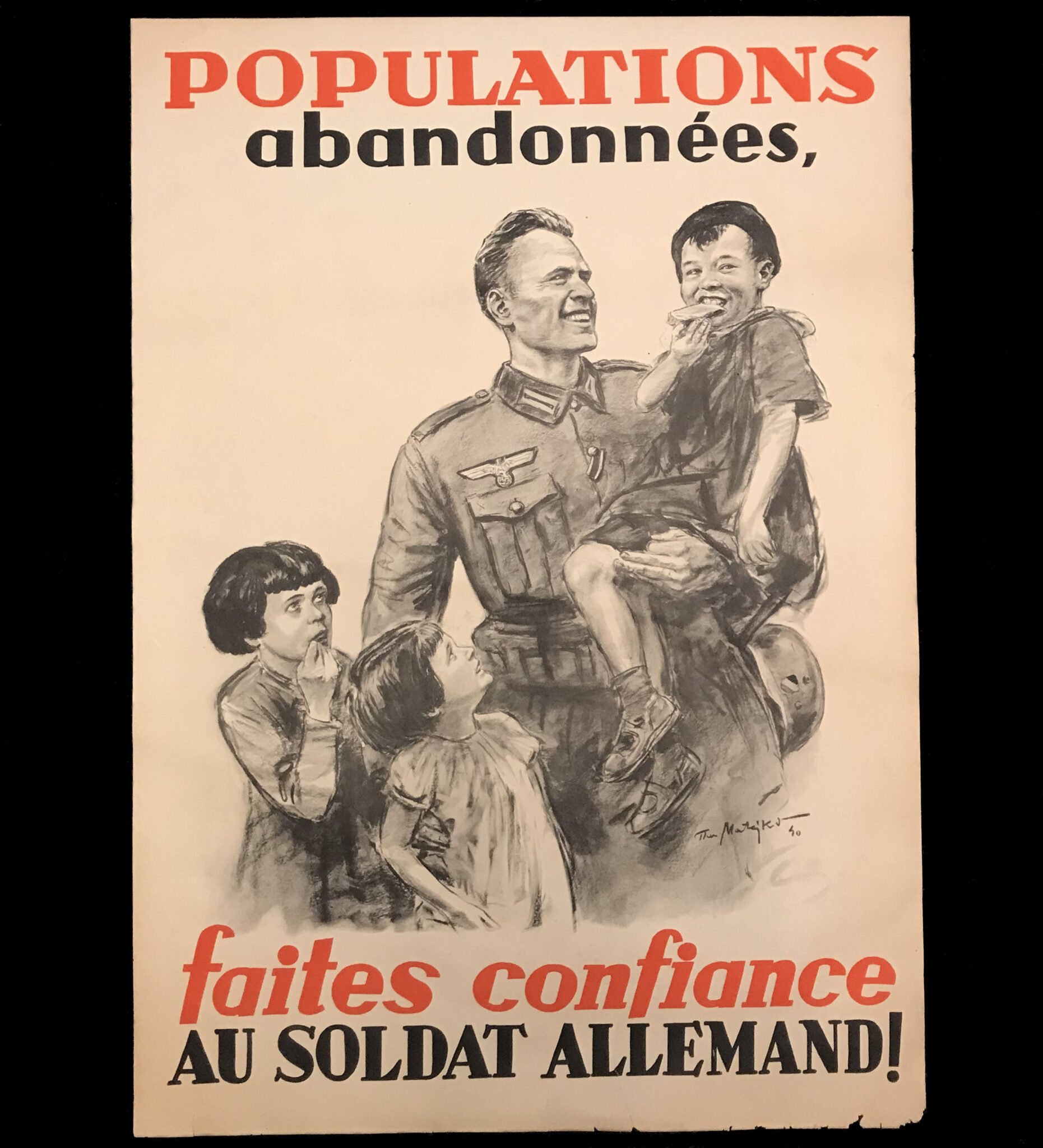 (Poster) Theo Matejko – Populations abandonnées, faites confiance au soldat Allemand![Translation: Abandoned populations, trust the German soldier!]Dated: 1940The size of the poster is approximately 122 x 86 cm.This is a rare poster to find, 100% original. The condition is good, but there are a few edge damages to the lower end. When framed this is invisble, we only saw this ourselves when taking it out of the frame it came in.Very hard to find Matejko poster. Among collectors Matejko is known for his typical style of art. This would make an amazing displaypiece in any collection room.Pickup prefereable (it came in a large frame), but we took it out for photographing. It can of course als0 be shipped in a cardboard roll for protection.