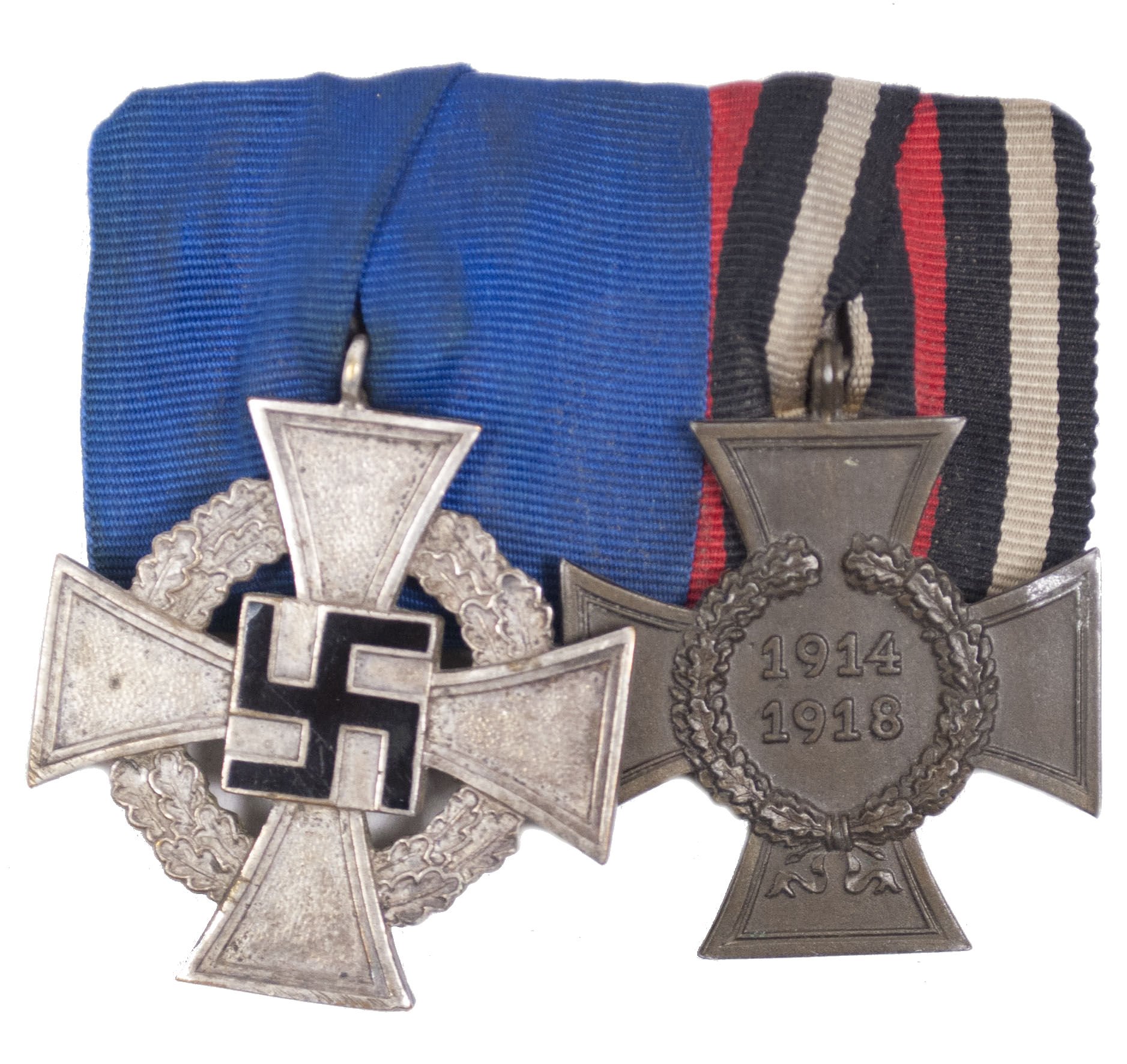German WWII medalbar with Treue Dienst 25 Jahre + Nichtkämpfer Ehrenkreuz.In good, worn condition.Rare to find in this combination as double medalbar.