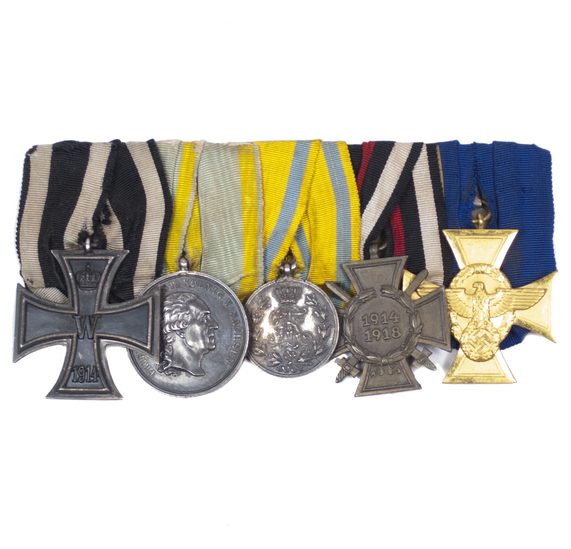 (Sachsen) WWII Medalbar with WWI Ek2, Sachsen silberne St. Heinrich medaille, Friedrich August medaille in silber, Frontkämpfer Ehrenkreuz, Polizei Dienstauszeichnung 25 Jahre.In good condition.Very hard to find like this and in this combination. Beautifull medals and an impressive police medalbar for a senior police officer.Rare!