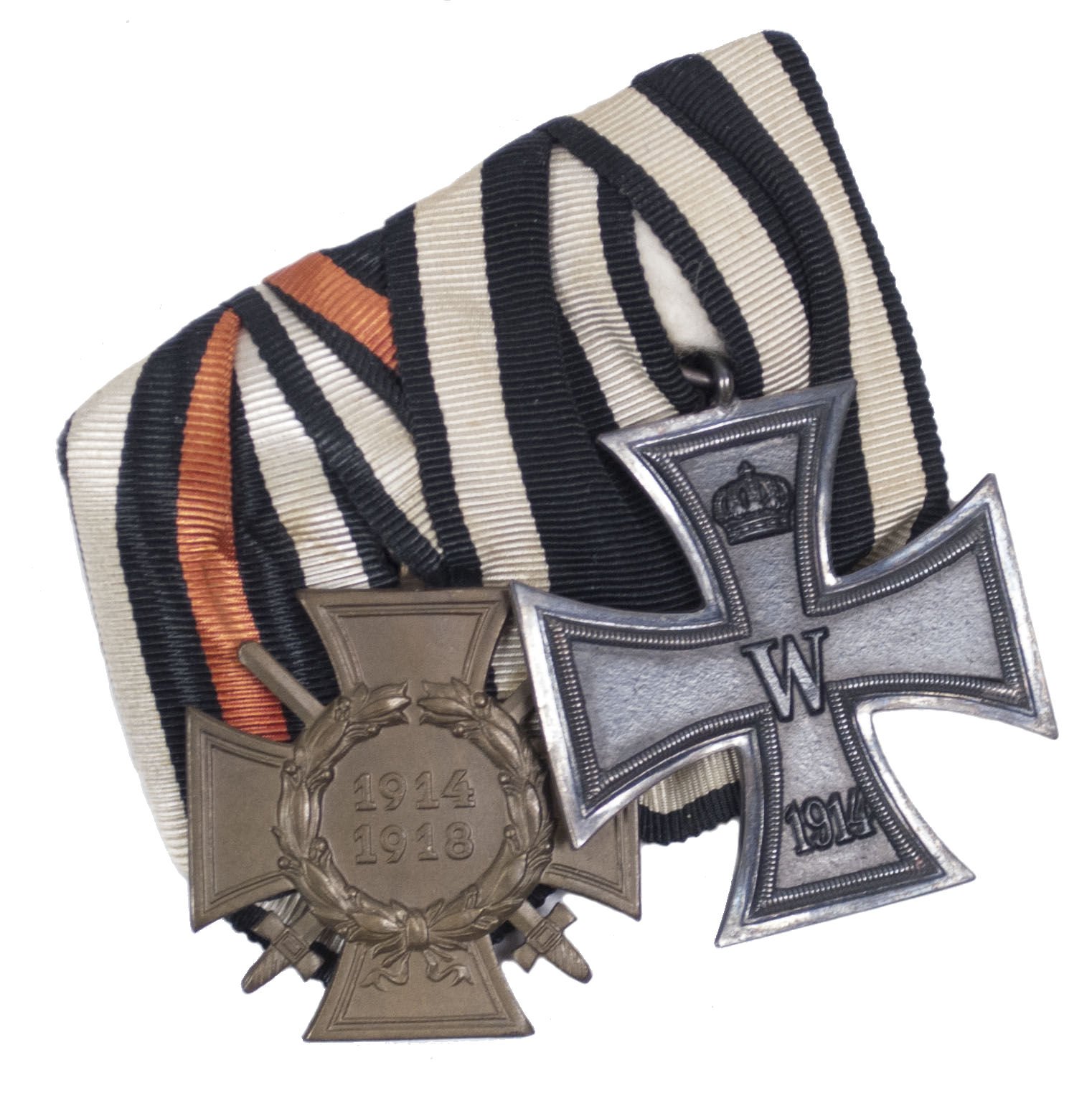 Double ribbonbar Frackspange with Iron Cross + Ehrenkreuz für Frontkämpfer.Diogonal mounted with the EK2 on top, for special wearing on a tuxedo. This style of old fashioned mounting is very hard to find!!!In good, light worn condition.