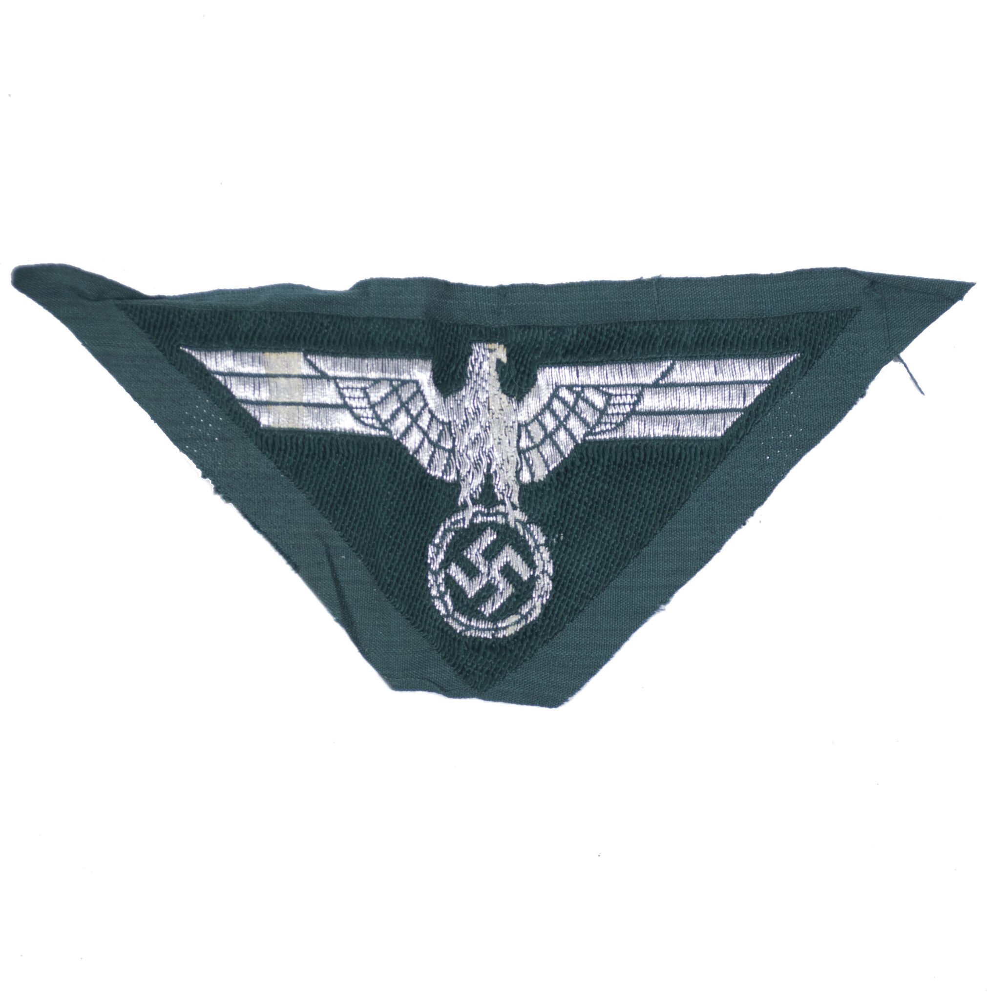 Wehrmacht (Heer) Model 44 Officers breasteagle in bullion.Silver bullion thread woven on a bevo dark green cloth background.Very rare to find late war breast eagle.In ver good condition.