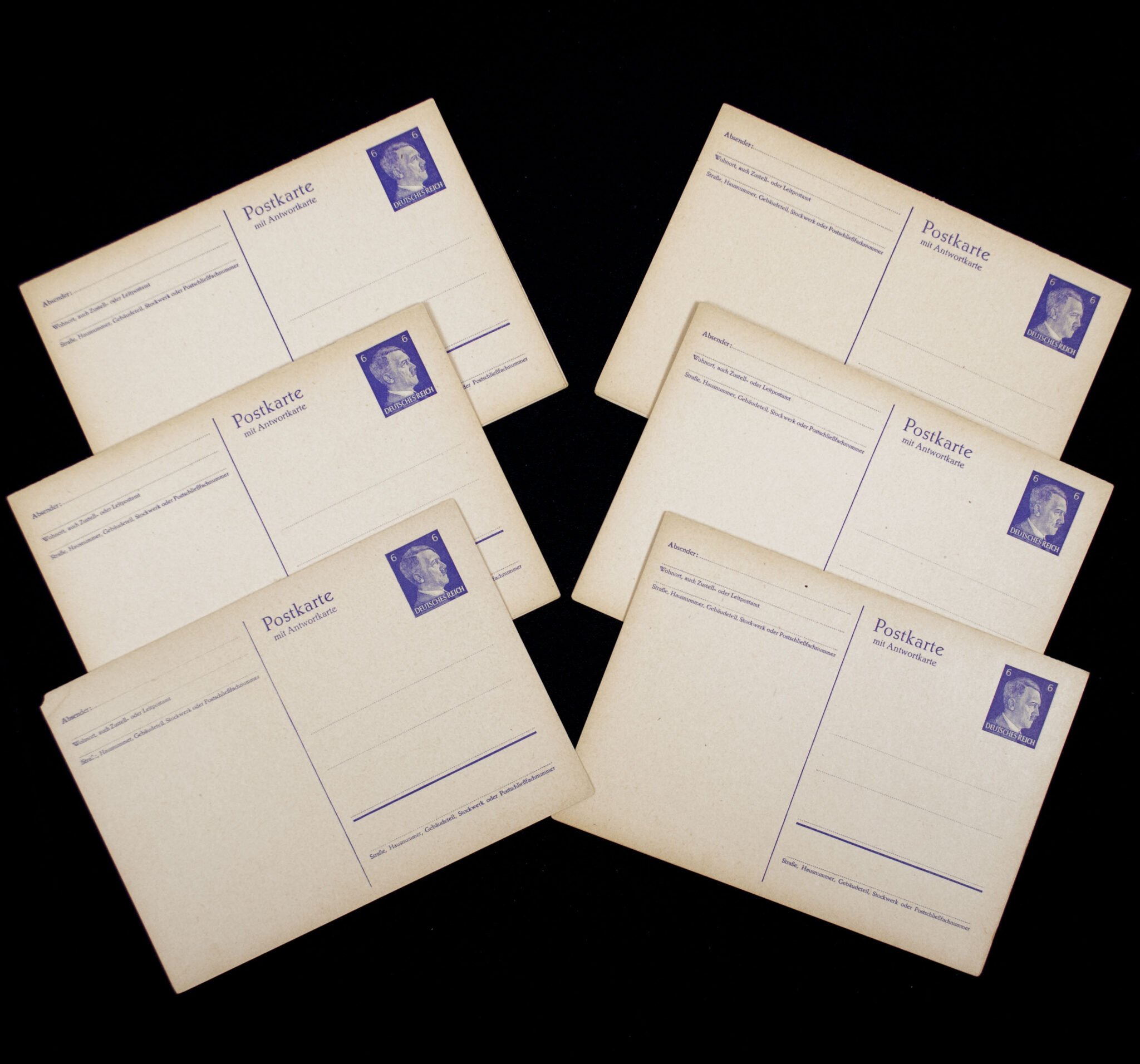 This is a small lot of six Adolf Hitler stamped, Postkarte mit Antwortkarte (postcard with attached answercard).All six are in unused mint condition.The price is for all six together!