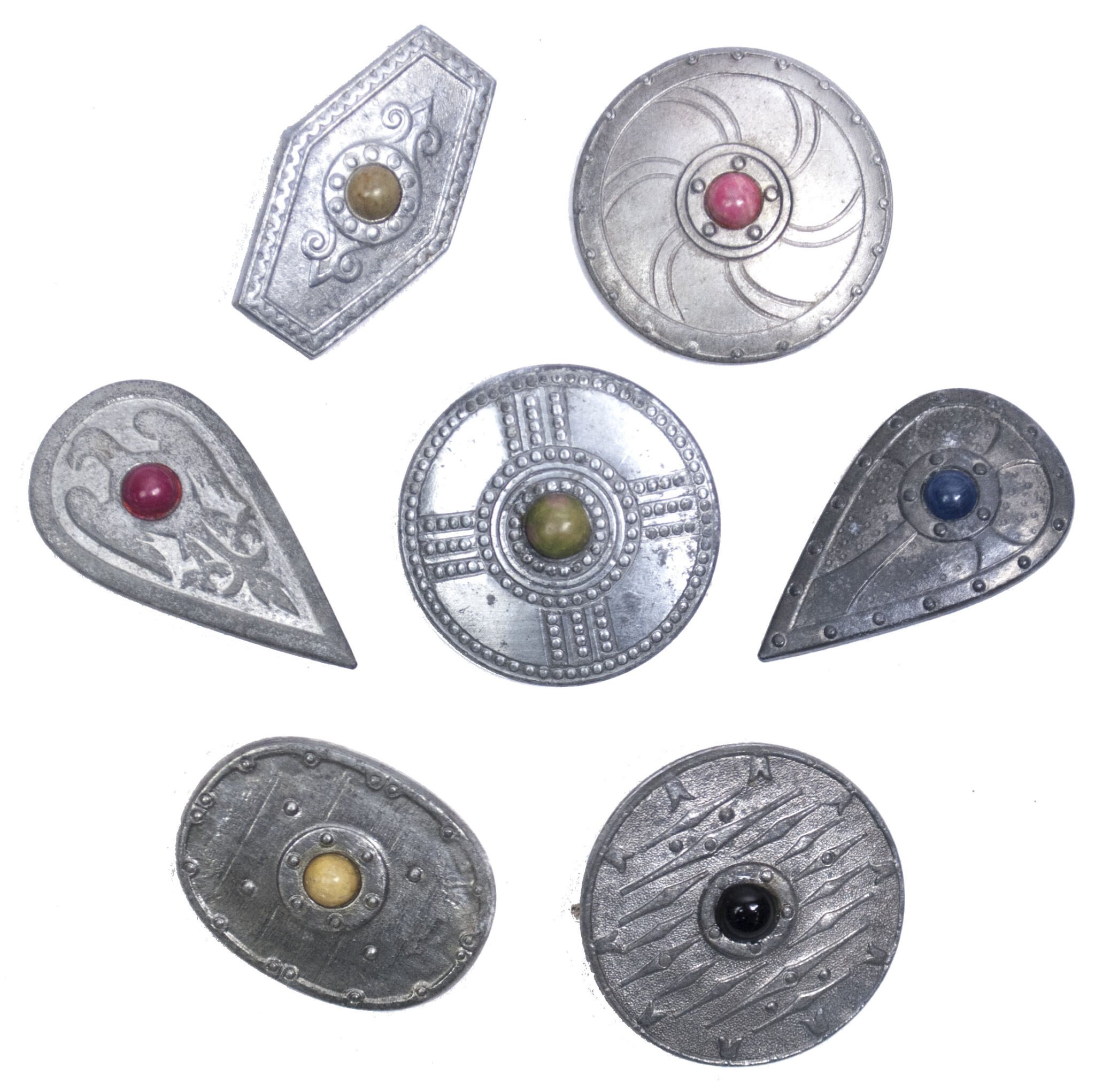 Winterhilfswerk (WHW) complete series of ancient Germanic shields.With in the front centre of each a so called half gem stone.All with working reverse needles for wearing.