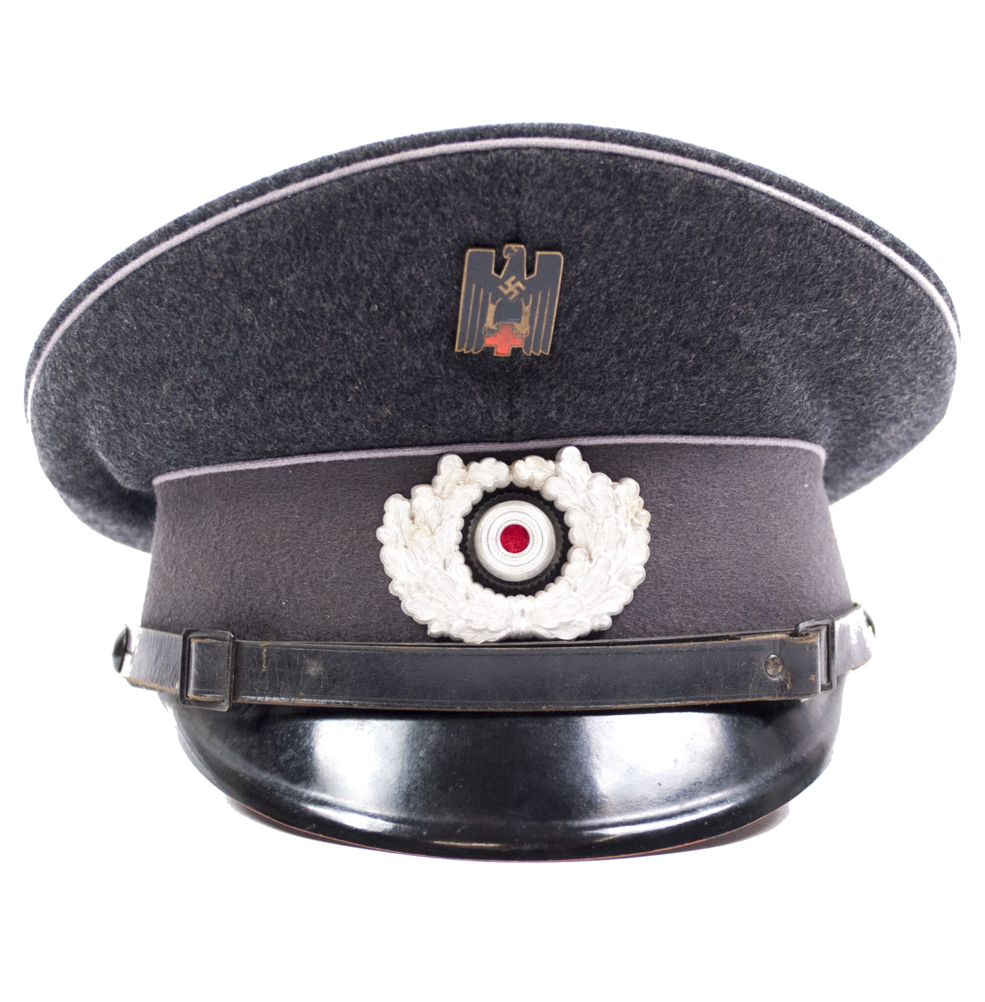 Deutsches Rotes Kreuz (DRK) 'Schirmmütze für Mannschaften' in very good condition!No mothholes (!), and in a very nice shape.The previous collector added some loose paper to keep it in shape.With enameled DRK eagle-badge, cocarde and leather stormband.Hard to find!