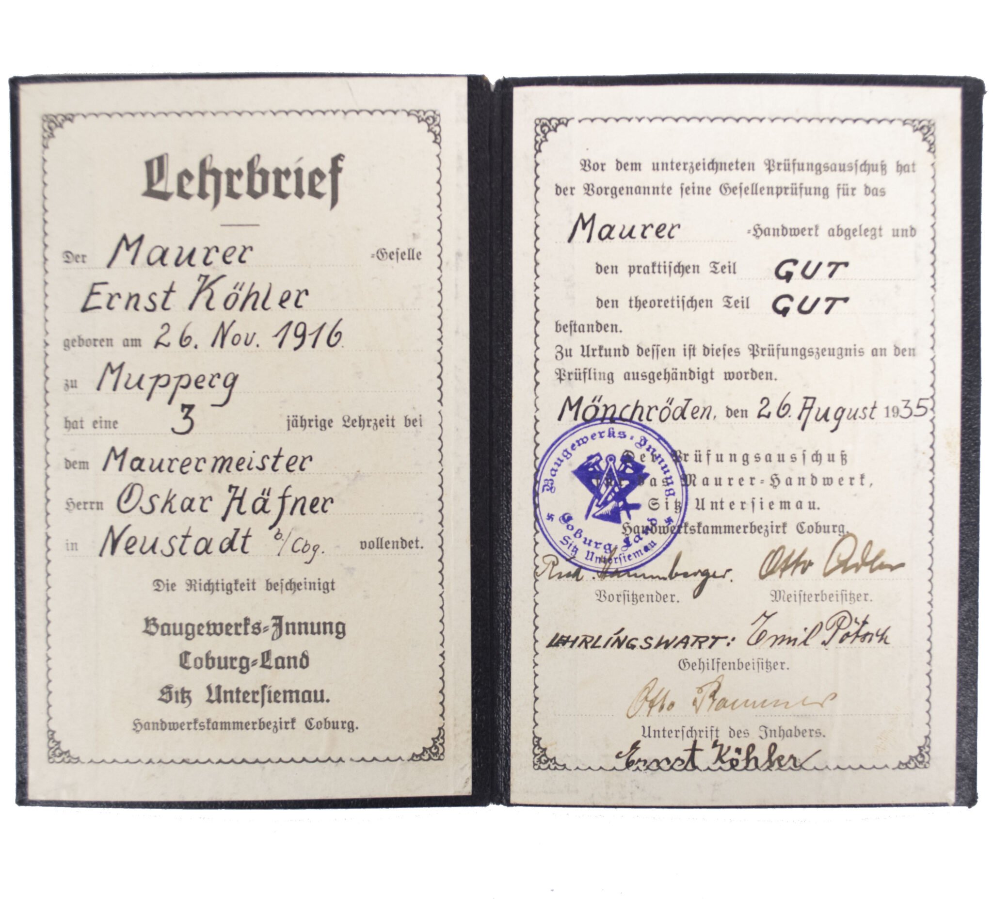 Lehrbrief Coburg-Land for a 'Maurer' (1935).With black outside cover.In good condition.