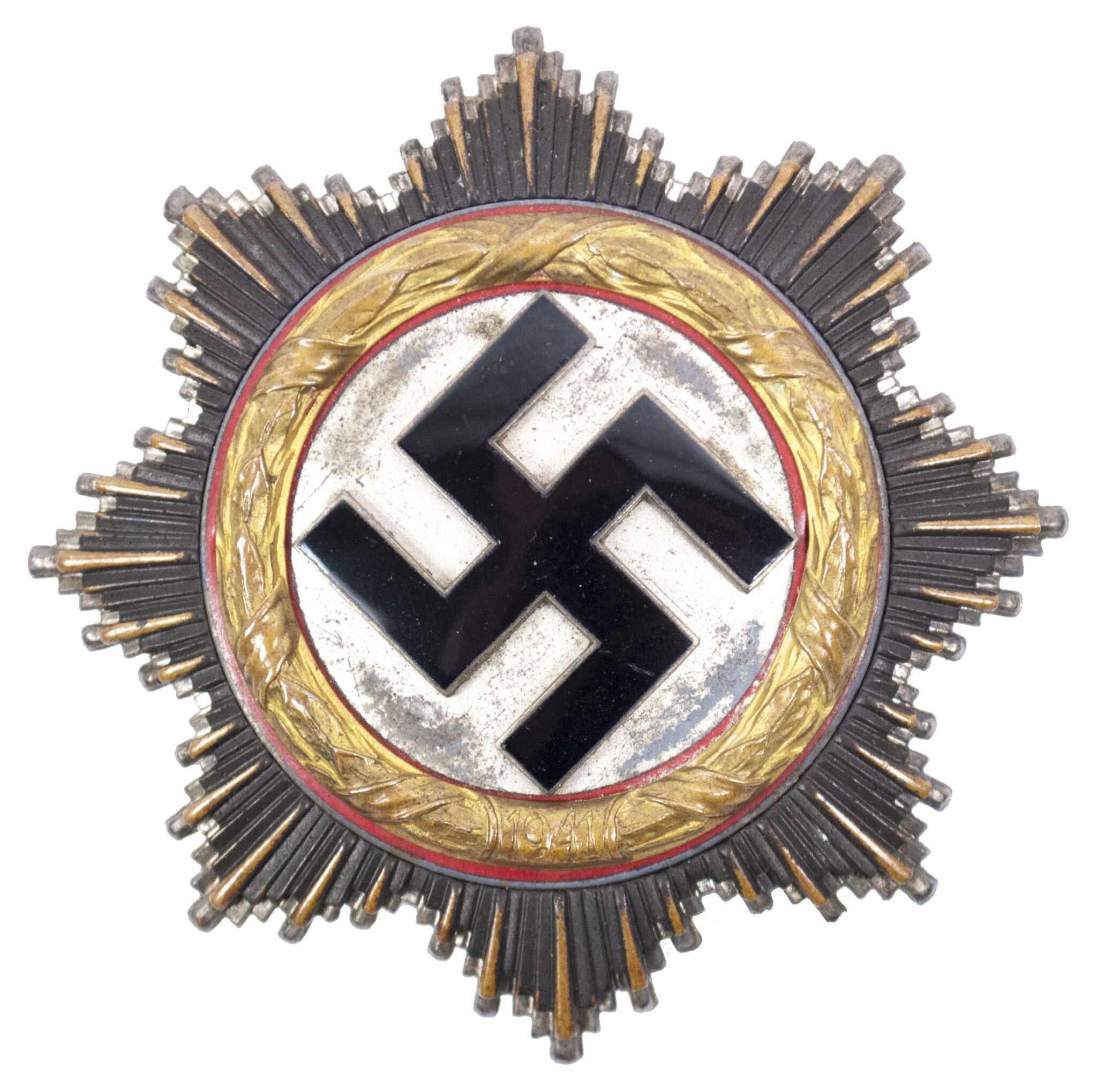This is an original Deutsches Kreuz in Gold (DKIG), by maker '20' (Carl Friedrich Zimmermann from Pforzheim).Typical textbook light Zimmermann. The pin on the underside marked with '20'In very good and only very light worn condition. The black enamel undamaged, the gold wreath in good condition. Lots of silvering on the 'mirror' uner the swastika still present. Nice patination. It just doesn't get much better!Very hard to find like this!!!