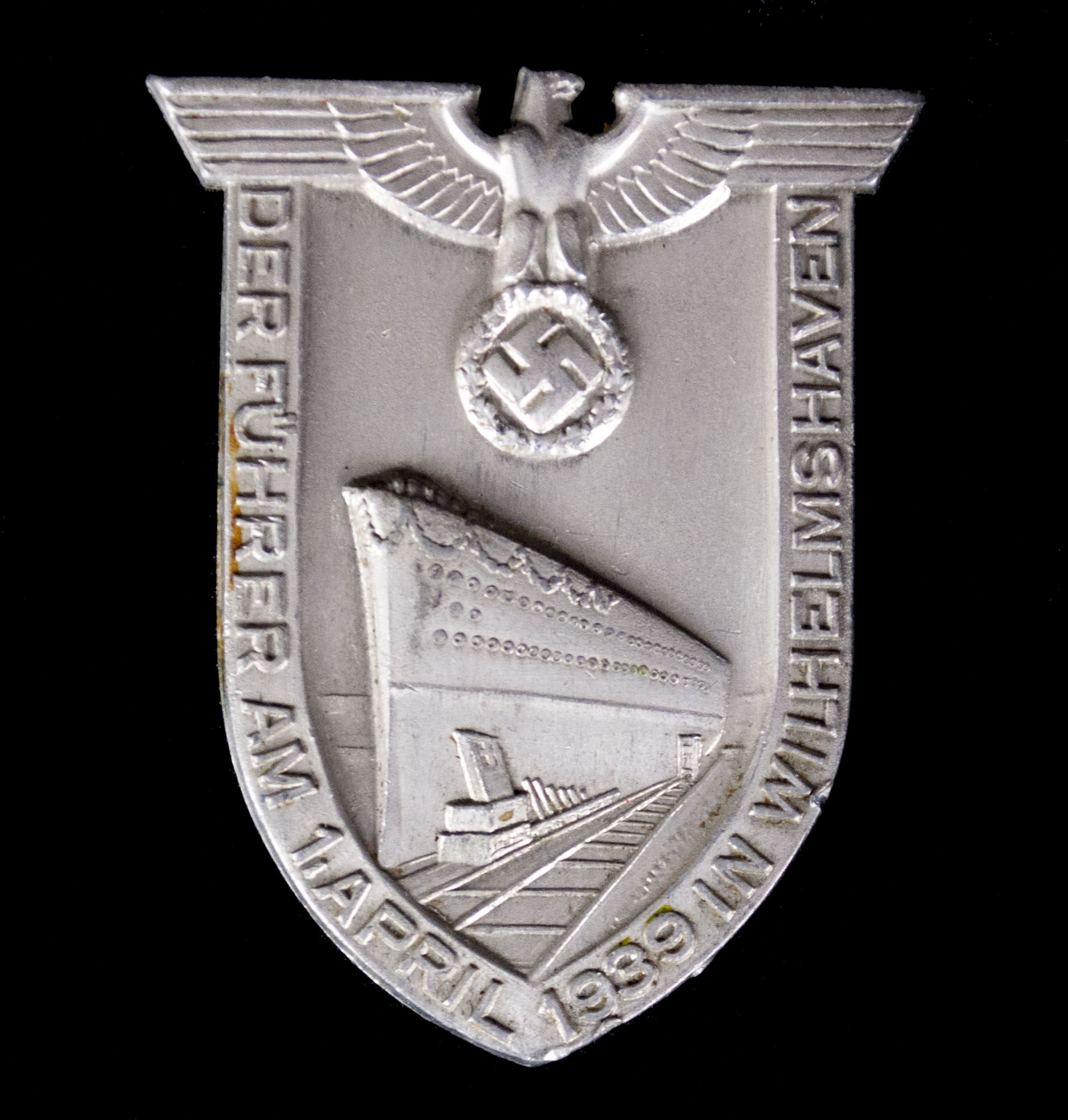Der Führer am 1 April 1939 in Wilhelmshafen abzeichen.Made of aluminium, in good condition, but with broken off needle.