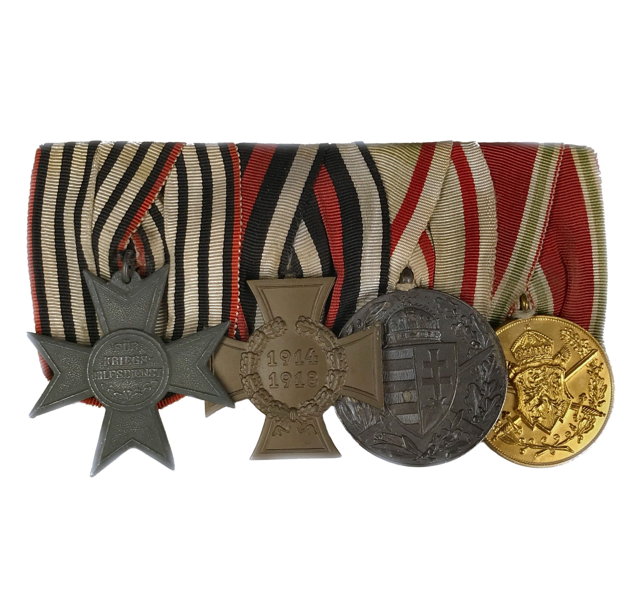WWI German medalbar with Kriegshilfskreuz + Nichtkampfer + Pro Deo et Patria + Rumanian WWI commemorative medal.On the back is a label by wellknown Germn medalmaker Godet! This is the most desirable imperial medalmaker.The condition is minty, in hand much better look than on photo.