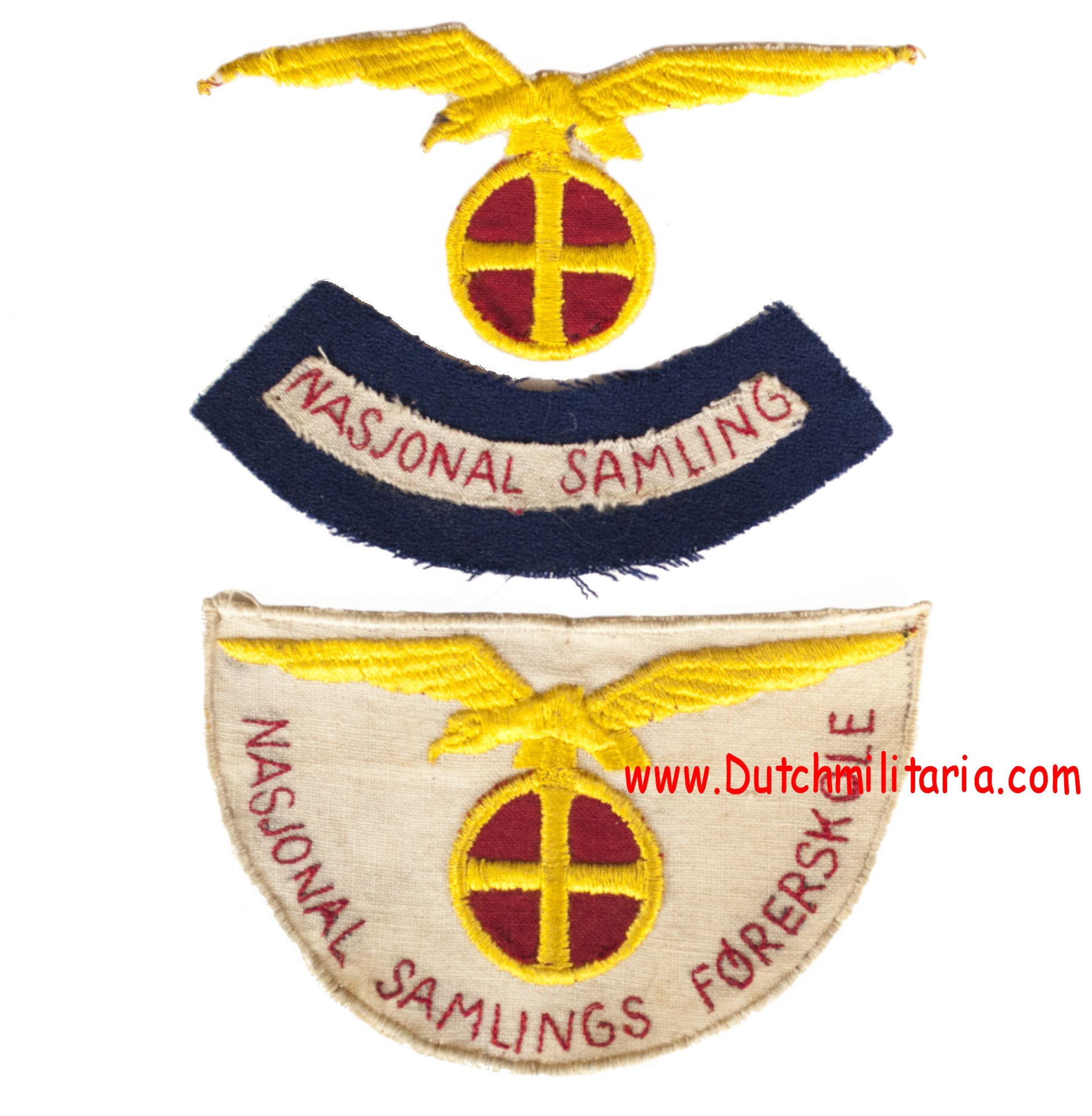 This is a rare small and very special offering: an original Nasjonal Samling Førerskole insignia lot.Im not aware of another example. The interesting thing is we can offer here the full half round arm insignia emblem, but also 'two parts': a seperate eagle and 'Nasjonal Samling' name tag.No other example can be found online or to my knowledge not even pictured in book (hence the red Dutchmilitaria watermarks). In David Littlejohns Foreign Legions book is a drawn (!) example pictured, i added a photo of the page from the book here. As can be read the colors were at the time not even known, but as you can see by the here offered lot it was white (creme) colored.Extremely rare!!! Only sold as a lot of all three parts together and i think the price is also very good! Try finding another!The origin of these items is a very old collection of which most items have not been on the collectorsmarket for 5 decades or more!