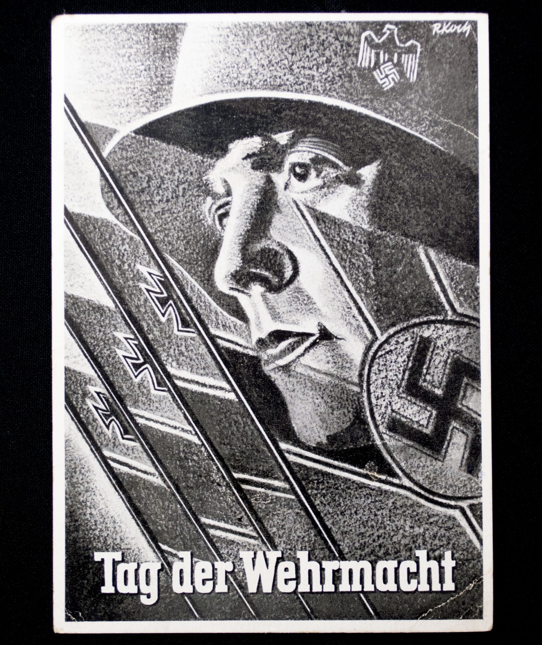Postcard: Tag der Wehrmacht 1940.With on the back two first day stamps from Dresden over three actual stamp.In good condition and hard to find!