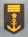 Original era manufacture. Introduced in 1942 to replace the more complicated round rating system. These rates were worn on both the IJN Square Rig uniform and the green NLF field uniform and used a system of small colored cherry blossoms to indicate the wearers military specialty. Black cotton shield with yellow cotton embroidered triple bar and anchor. At the time of our purchase this rate was missing its yellow service branch blossom, we installed one from a small cache of originals here in the office.