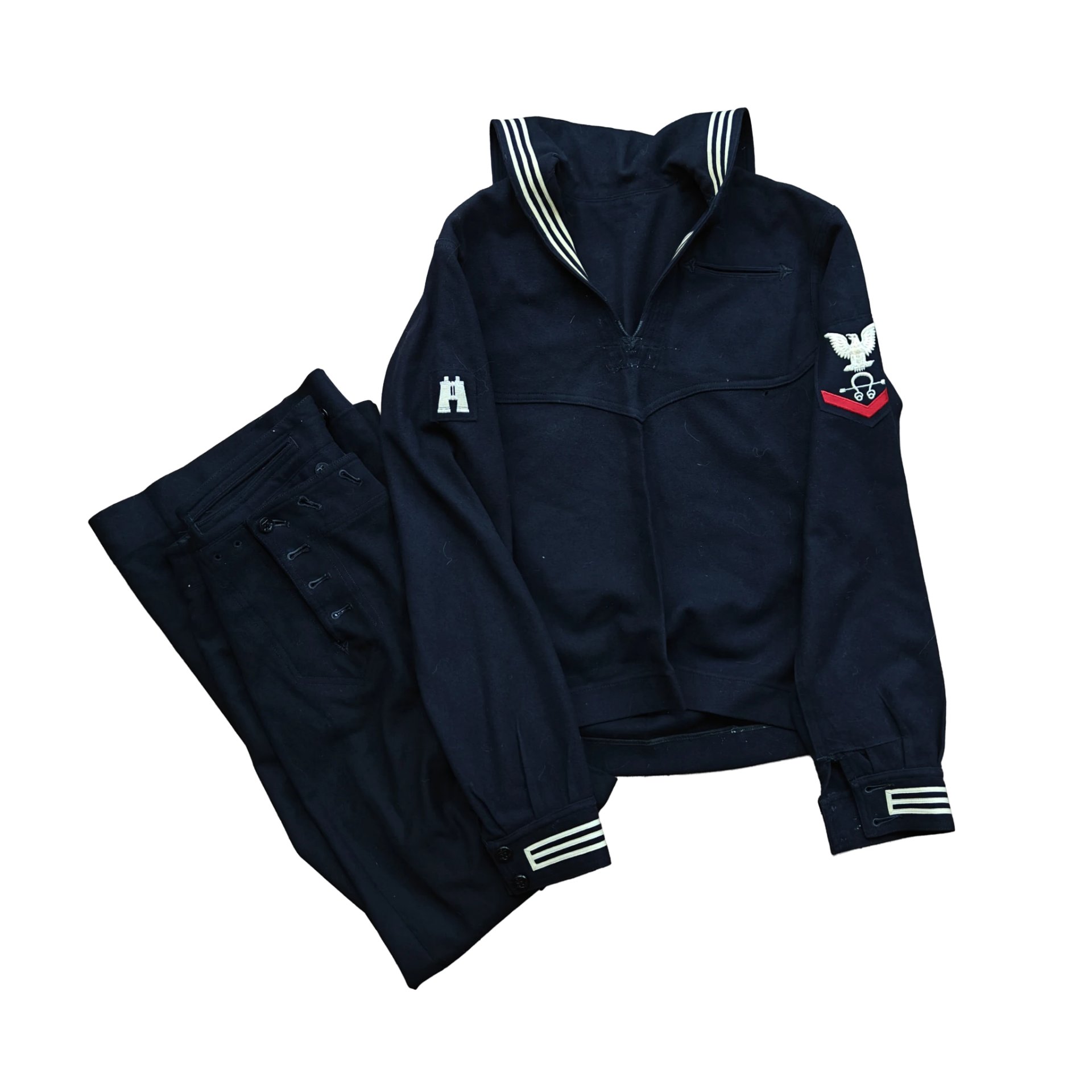 WWII/Korea US Navy uniform groupingDe set is mooi met zowel de jas als broek! De set behoorde tot een Sonarman binnen de Amerikaanse Navy. Het jasje heeft geen label, vermoedelijk is deze van net na de oorlog. Een mooie set voor eventueel onderzoek en een leuke aanwinst voor de Amerikaanse militaria verzamelaar!WWII/Korea US Navy uniform setThis beautiful set includes both the jacket and trousers! It belonged to a sonarman in the US Navy. The jacket has no label, presumably from just after the war. A nice set for research and a great addition for any American militaria collector!