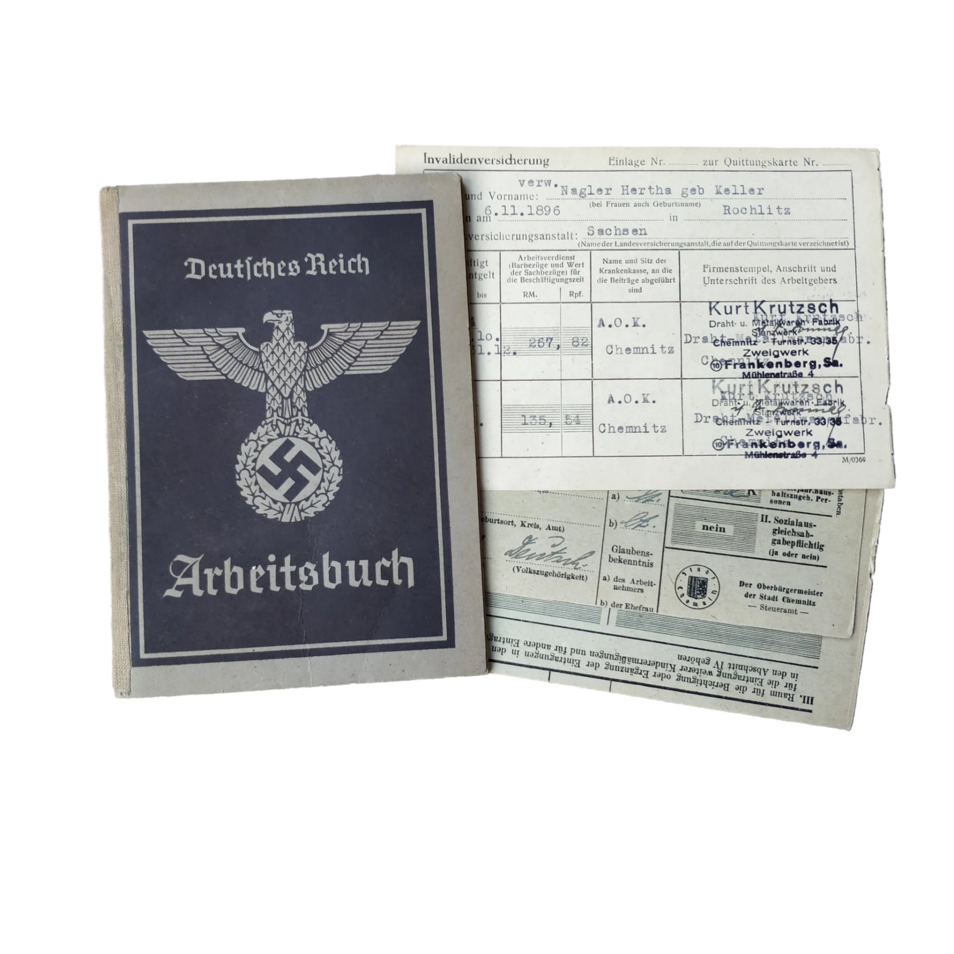 WWII Duits arbeitsbuchHet arbeitsbuch is erg bekend, het hoort thuis in elke collectie van de Duits verzamelaar. Uiteraard heeft het arbeitsbuch wat gebruikssporen. Een interessante toevoeging aan de collectie!WWII German ArbeitsbuchThe arbeitsbuch is very well known, it belongs in every collection of the German collector. Of course the workbook has some signs of use. An interesting addition to the collection!