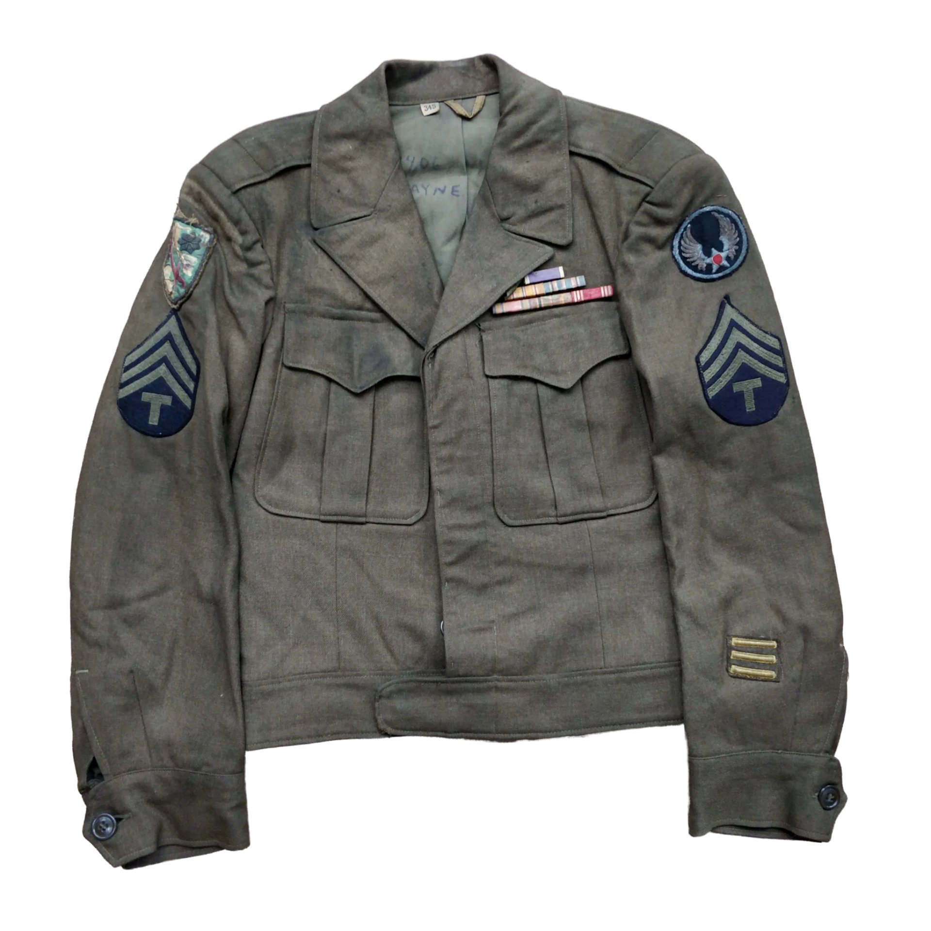 WWII Amerikaanse Ike JacketDe Ike Jacket is nog in nette staat, hij is wel vies. De Jas was van een soldaat die onderdeel was van de Amerikaanse Air Force en Persian Gulf Command. De rang van de soldaat was Technician 5th grade. In de kraag staan nog zijn naam en laundry code.De jas is netjes gedateerd 1945 en komt met bullion Air Force en Bullion persian gulf command patches en 3 overseas bars. Ook heeft de jas verschillende ribbon bars voor de Purple Heart Medal, Asiatic Campaign Medal, American Campaign Medal, WWII Victory medal, Euro/African Campaign medal en de Good conduct Medal. Een zeer mooie ike jacket voor de Amerikaanse militaria verzamelaar!WWII American Ike JacketThe Ike Jacket is still in good condition, though it is dirty. It belonged to a soldier who served in the U.S. Air Force and Persian Gulf Command. His rank was Technician 5th Grade. His name and laundry code are still inscribed on the collar.The jacket is neatly dated 1945 and comes with bullion Air Force and bullion Persian Gulf Command patches and three overseas bars. It also has several ribbon bars for the Purple Heart Medal, Asian Campaign Medal, American Campaign Medal, WWII Victory Medal, Euro/African Campaign Medal, and the Good Conduct Medal. A very nice Ike jacket for the American militaria collector!