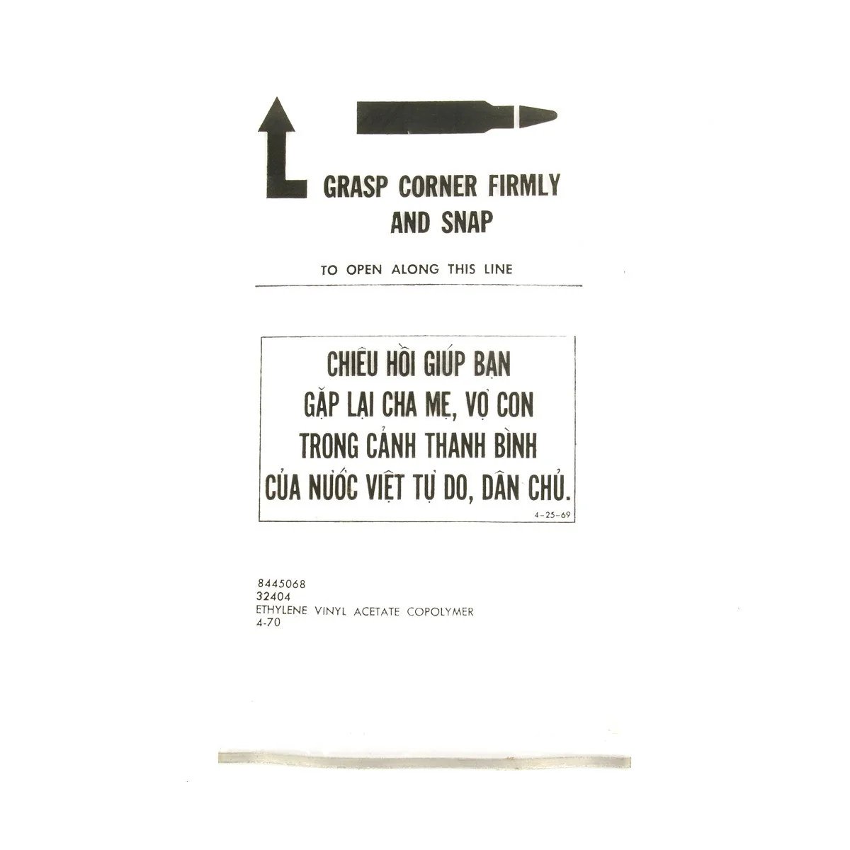 Item DescriptionOriginal Item: And you thought it was just another disposable plastic bag, didn't you? You probably have seen them around, usually used as a cheap bag for small items. Actually, they were part of a ten-year-long psychological operations (PSYOP) program to get Viet Cong personnel to come over to the government side during the Vietnam War. 'Chieu Hoi' means 'open arms.' The program lasted from 1963 to 1973, although the use of the magazine bags began later, as American involvement escalated.The bag is designed to hold one twenty-round M16 magazine and to protect it from the elements. A built-in metal strip allows the bag to be sealed well. The bag was also designed to be thrown away after the magazine was removed, then to be picked up and read by an enemy combatant. The combatant could then use the bag as a 'get home free pass' to leave the Viet Cong. The bags were only one small part of the Chieu Hoi program, which eventually resulted in about 100,000 desertions from the Viet Cong.The full translation reads: Returning Chieu Hoi will help you to again see your parents and family in a peaceful and democratic South Vietnam.IMA is offering five bags for $3.95, for a very economical bit of the history of one our most traumatic national experiences. Straight from the original boxes.Shipping RestrictionsThis product is available for international shipping.Payment OptionsEligible for all payments - Visa, Mastercard, Discover, AMEX, Paypal & Sezzle