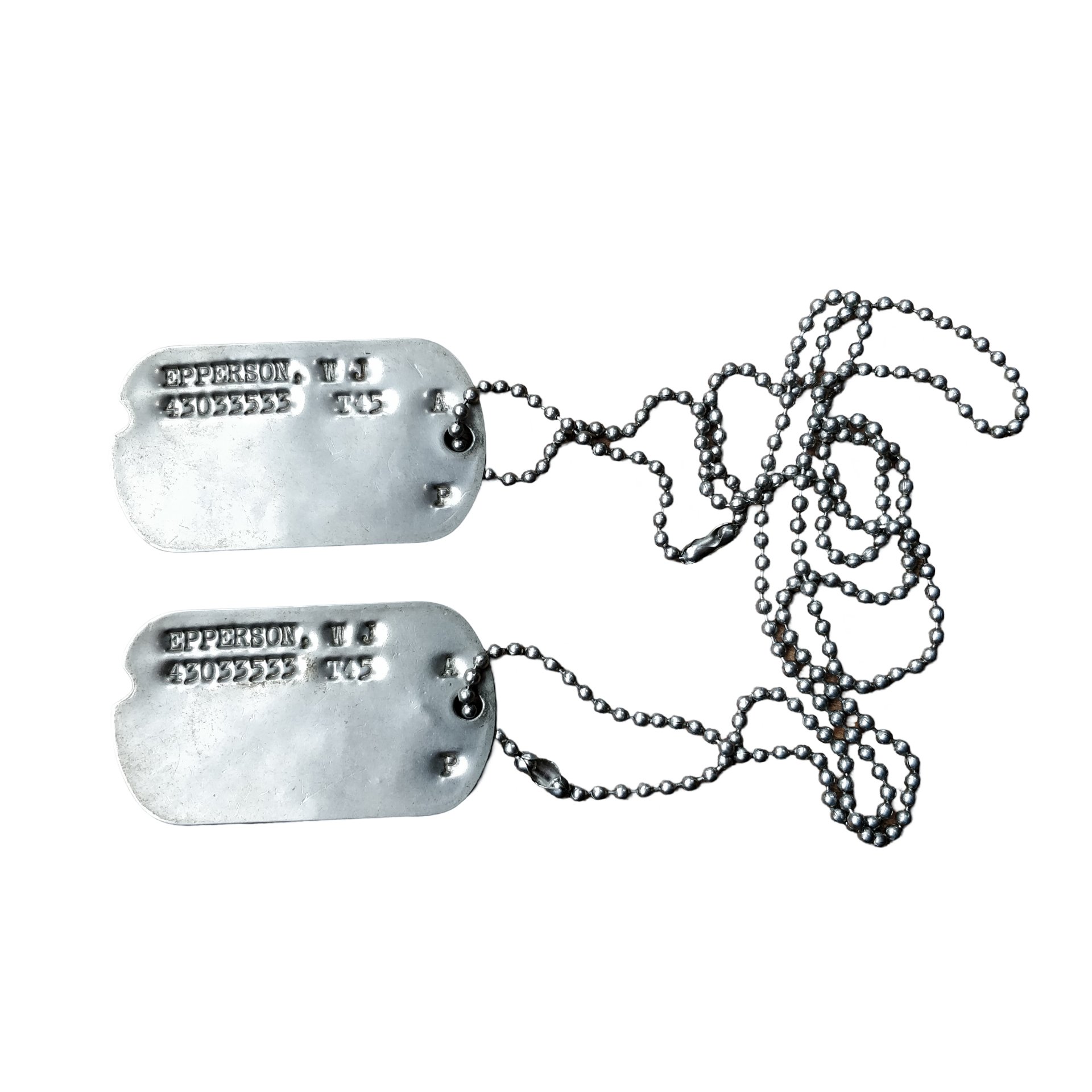 WWII Amerikaanse Dog Tag SetDe dog tag set is in nette staat en bestaat uit 2 plaatjes met ketting. Deze identificatie plaatjes werden door Amerikaanse soldaten gedragen tijdens de Tweede Wereldoorlog. Deze dog tags zijn op naam van Epperson. Een interessant stuk voor de US verzamelaar!WWII American Dog Tag SetThe dog tag set is in neat condition and consists of 2 plates with chain. These identification tags were worn by American soldiers during World War II. These dog tags are in the name of Epperson. An interesting piece for the US collector!