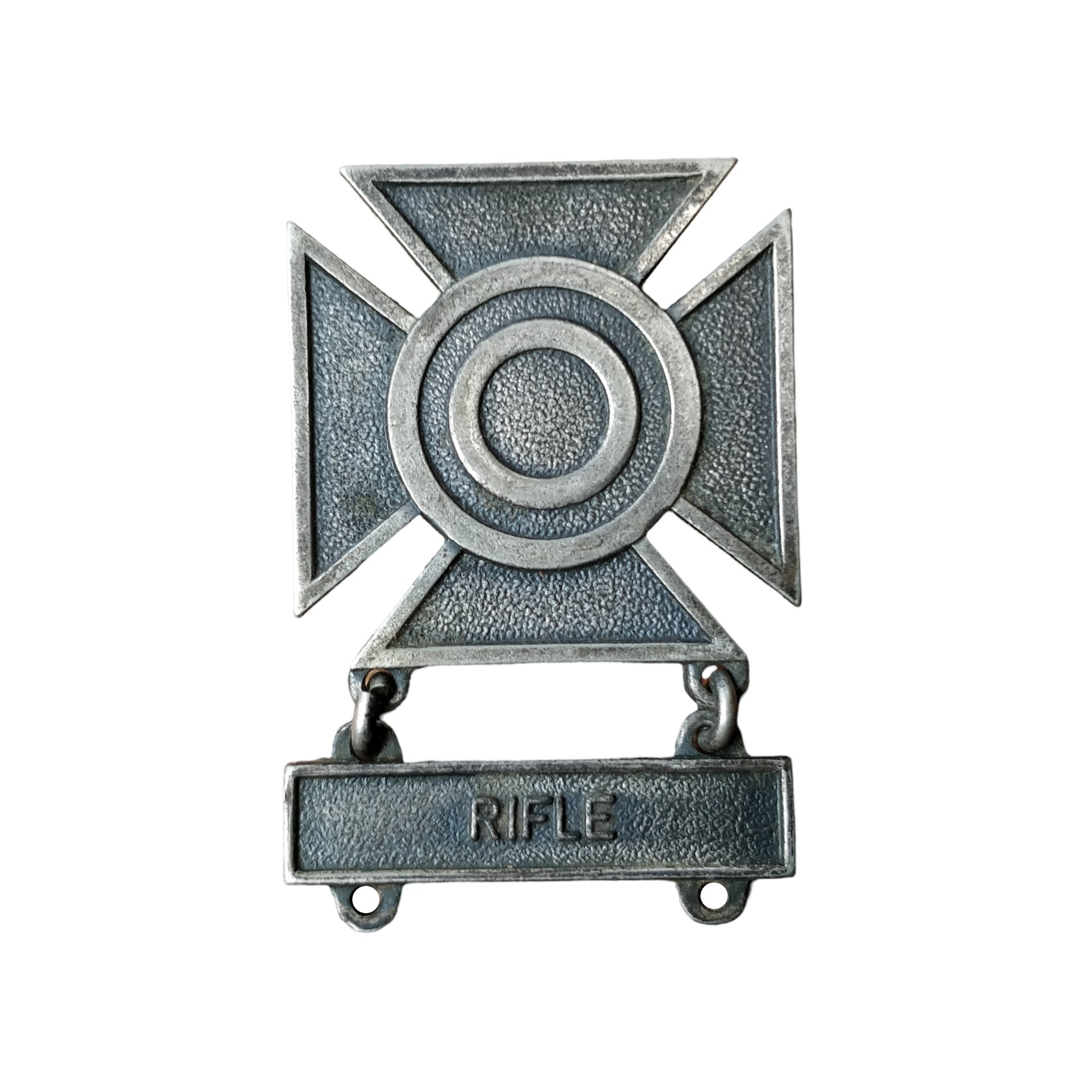 WWII Amerikaanse marksman badgeDeze werden gedragen door soldaten die gespecialiseerd waren in het gebruik van een bepaald wapen. Daarvoor kregen zijn een hangertje wat hieronder werd gedragen, in dit geval Rifle.WWII American marksman badgeThese were worn by soldiers who specialized in the use of a particular weapon. For this they received a pendant that was worn below, in this case a Rifle!