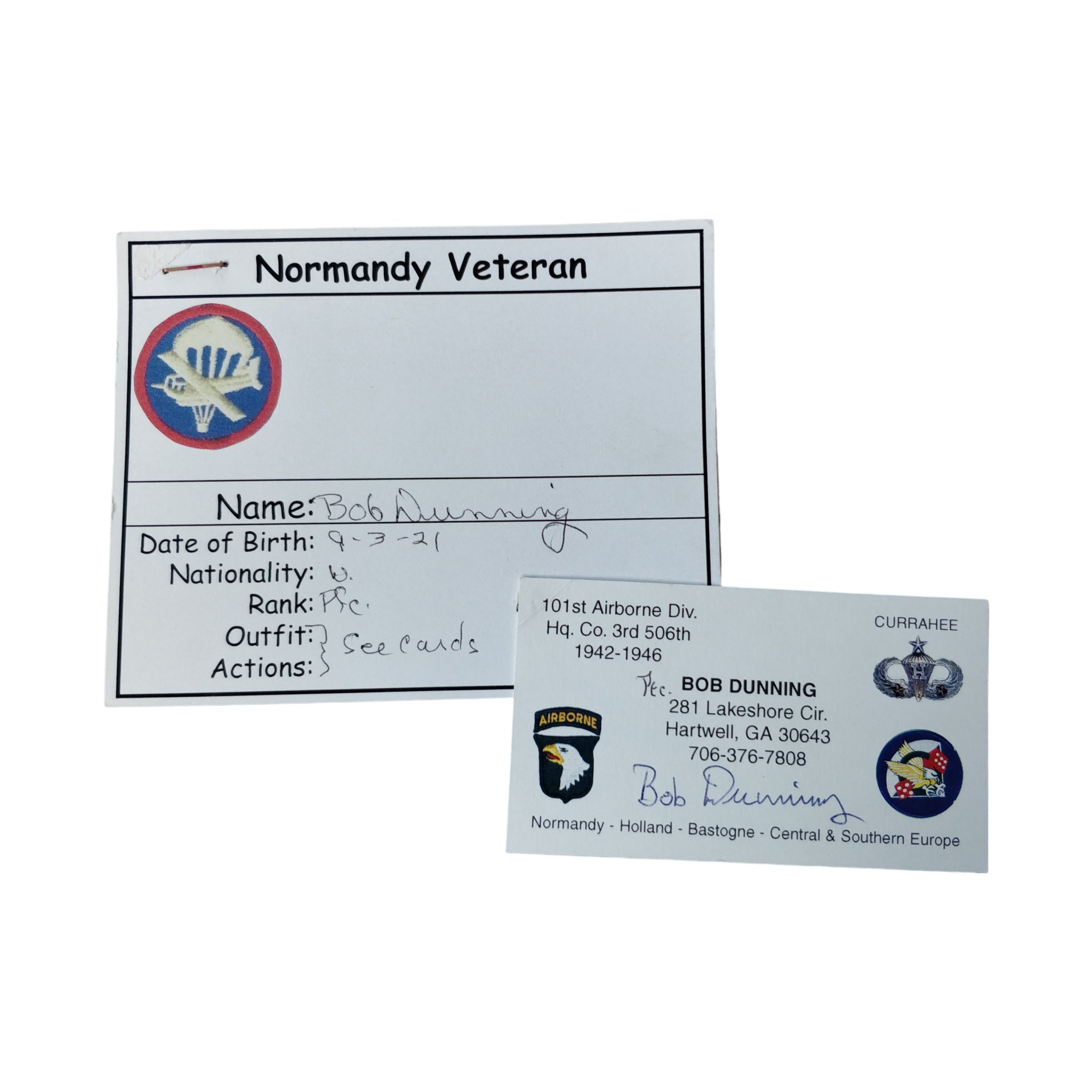 WWII Amerikaanse handtekening veteraanDe set handtekeningen is in goede staat en het betreft hier handtekeningen van Bob Dunning. De handtekeningen zijn gezet op een visitekaartje en een informatiekaartje. Dunning was onderdeel van de 101st Airborne, Headquarters Company van de 506th Parachute Infantry Regiment. Een gave set van twee handtekeningen voor de airborne verzamelaar!WWII American veteran signatureThe set of signatures is in good condition and concerns signatures of Bob Dunning. The signatures were placed on a business card and an information card. Dunning was part of the 101st Airborne, Headquarters Company of the 506th Parachute Infantry Regiment. A cool set of two signatures for the airborne collector!