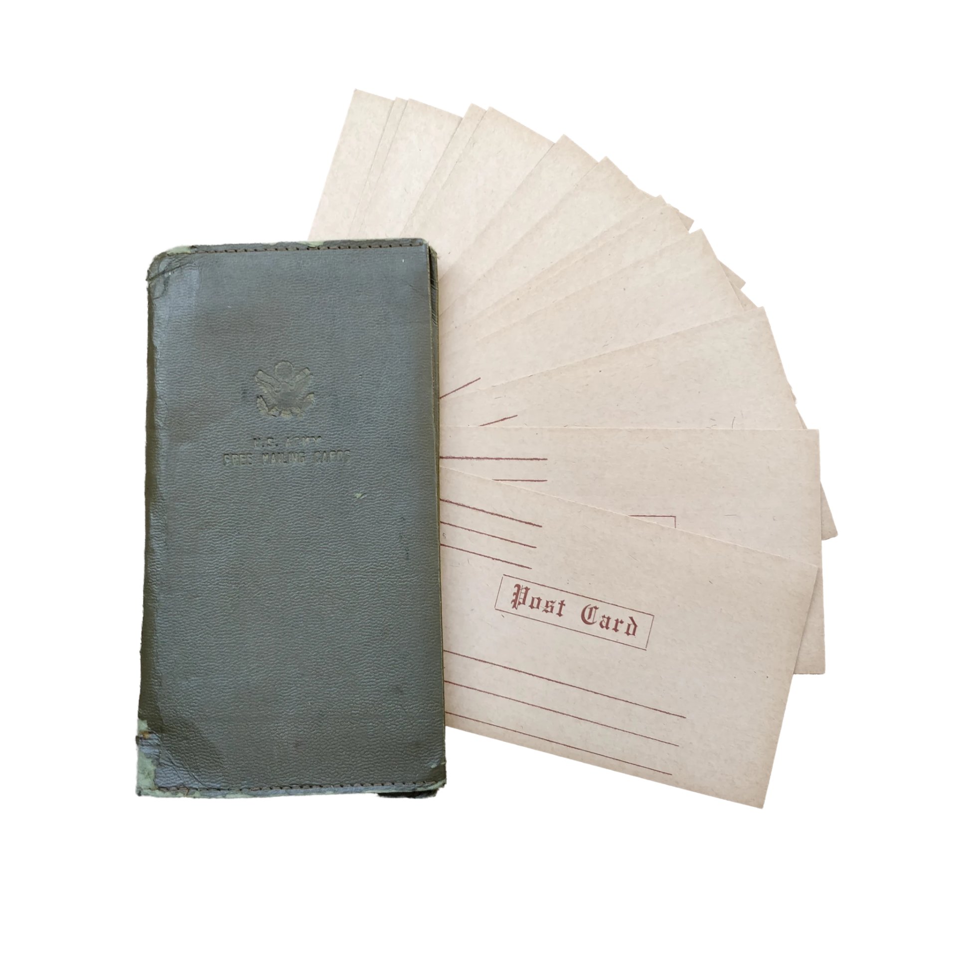 WWII Amerikaans mapje met postkaartenHet mapje heeft wat gebruikssporen aan de rugzijde en een scheurtje aan de onderkant, verder is het nog in nette staat. Het mapje komt met 13 postkaarten. Een leuke set voor een persoonlijke display!WWII American folder with postcardsThe folder has some traces of use on the back and a tear at the bottom, otherwise it is still in good condition. The folder comes with 13 postcards. A nice set for a personal display!