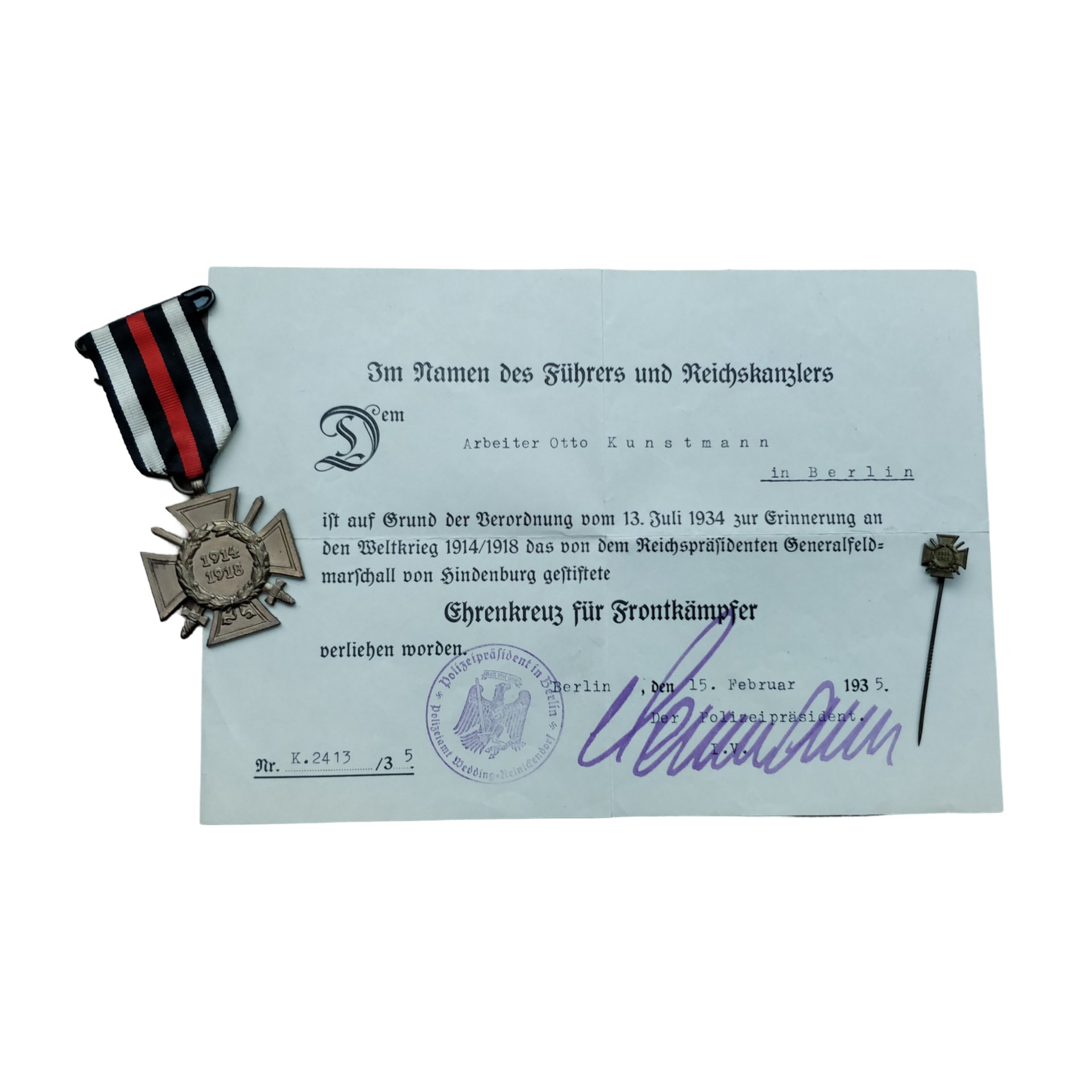 WWI Duitse Frontkampfer medaille setDe set is in nette staat en bestaat uit een oorkonde, medaille en miniatuur stickpin. Een mooie complete set voor je Duitse medaille collectie!WWI German Frontkampfer medal setThe set is in neat condition and consists of a certificate, medal and miniature stickpin. A nice complete set for your German medal collection!
