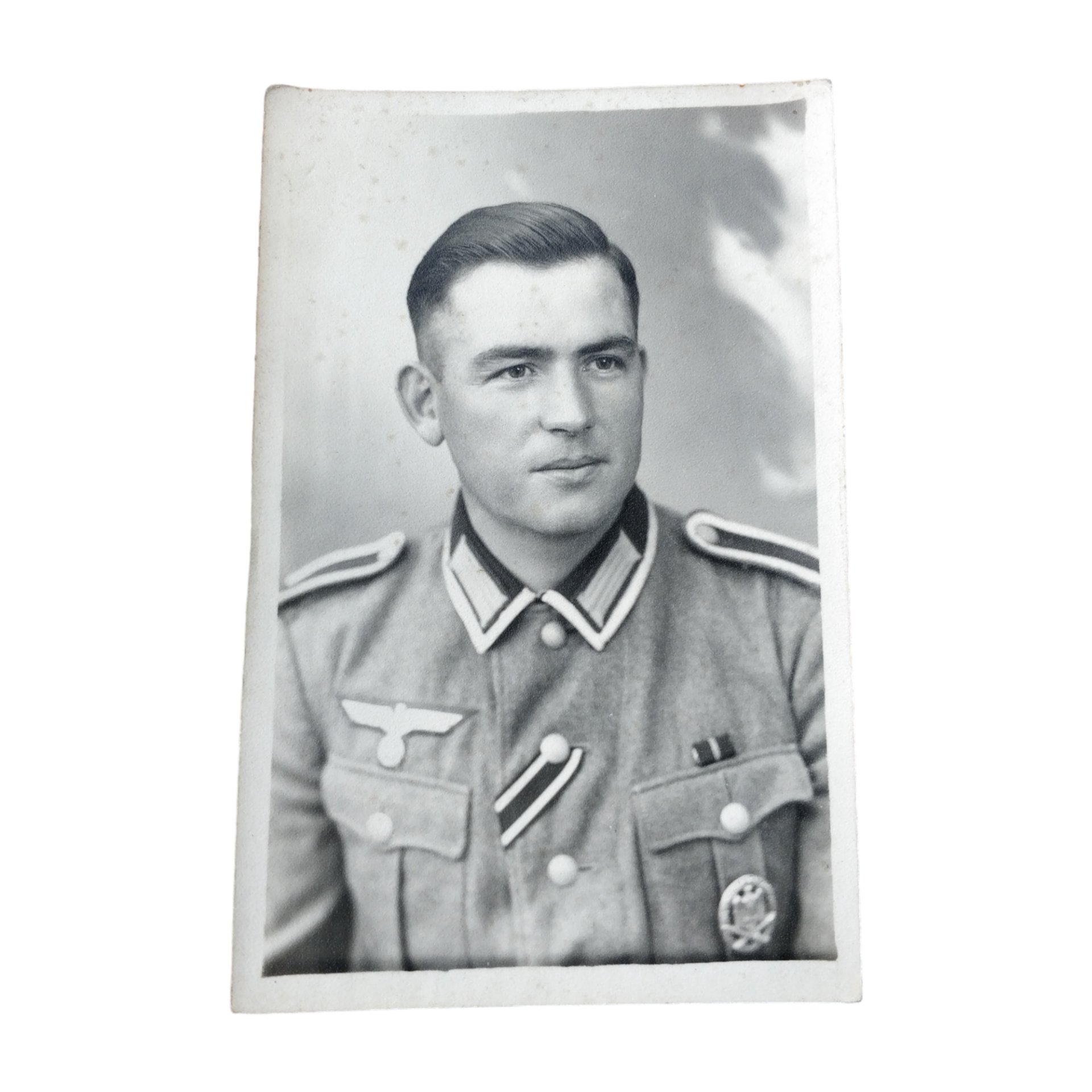 WWII Duitse PortretfotoEen mooie portretfoto van een Duitse soldaat. De foto heeft het formaat van een postkaart. Een mooi stuk voor je militaria verzameling!WWII German Portrait PhotoA beautiful portrait photo of a German soldier. The photo is the size of a postcard. A beautiful piece for your militaria collection!