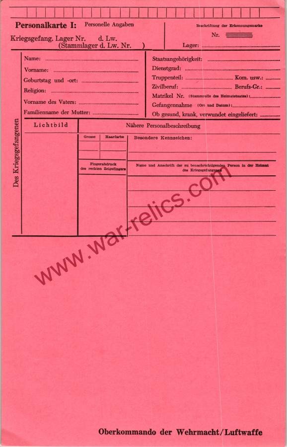 These are near mint conditioned un used cards that were taken by a service man after liberating a POW camp. The soldiers picture, personal information and fingerprint would be on these. There are several filled out examples of this particular card stock available to view online if you search. POW cards that are filled out are very rare. I'm not even sure anyone else has ever offered up blanks before. So for the price, don't delay. We have a punch of these and they are all in similar condition. You will not get the exact one in the picture, but you wouldn't be able to tell the difference anyway since they are all near mint with no writing or damage. These are excellent items for anyone doing a POW project and looking for reasonably priced material. The cards are about 11inches by 7 inches.