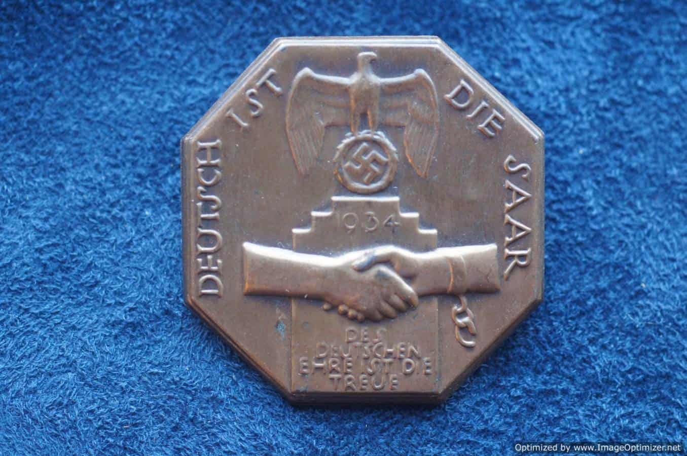 constructed out of a die stamped steel base that has been bronze washed. The octagon shaped obverse depicts an early closed winged eagle a clutching a wreathed swastika in its talons, above two shaking hands (one has a chain on his wrist), and a podium which reads: ?1934 Des Deutschen Ehreist Die Treue?. The top/sides also read ?Deutsch 1st Die Saar?. The reverse shows a hollow back and has a soldered on well working tombak pin. It measures approximately 1 ? inches wide and tallThis is one of the nicer condition ones ive seen available!
