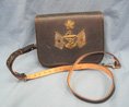 Original era manufacture. Black pigskin pouch which measures roughly 9x2x7 inches. On the front flap are applied chrome and brass metal devices. Circular loops on each side of the pouch serve as mounting points for the shoulder strap. Very similar in size and design of a US Civil War cartridge box. First one we have ever offered. Light age and wear.