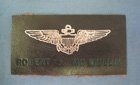 Original era manufacture. 2x3 inch brown leather patch with a gold finished Navy pilots wing embossed into its surface, the pilot's name is stamped below. This individual saw service in the US Navy during WWII-Korea-Vietnam and was a graduate of the Navy's V-5 pilot training program.