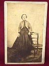 This CDV is of a young lady in her Civil War era attire. She wears a Zouave jacket and stands next to a cained seated chair. The back of the image has an advertisement for A. W. Abraham, Cheap Photograph Car, 28 Michigan Ave., Near the corner of Rosss & Co's Lumber Yard. Best Card Photographs:He gives the size, quantity and cost. Card pictures made from Daguereotypes or Ambrotypes. $20
