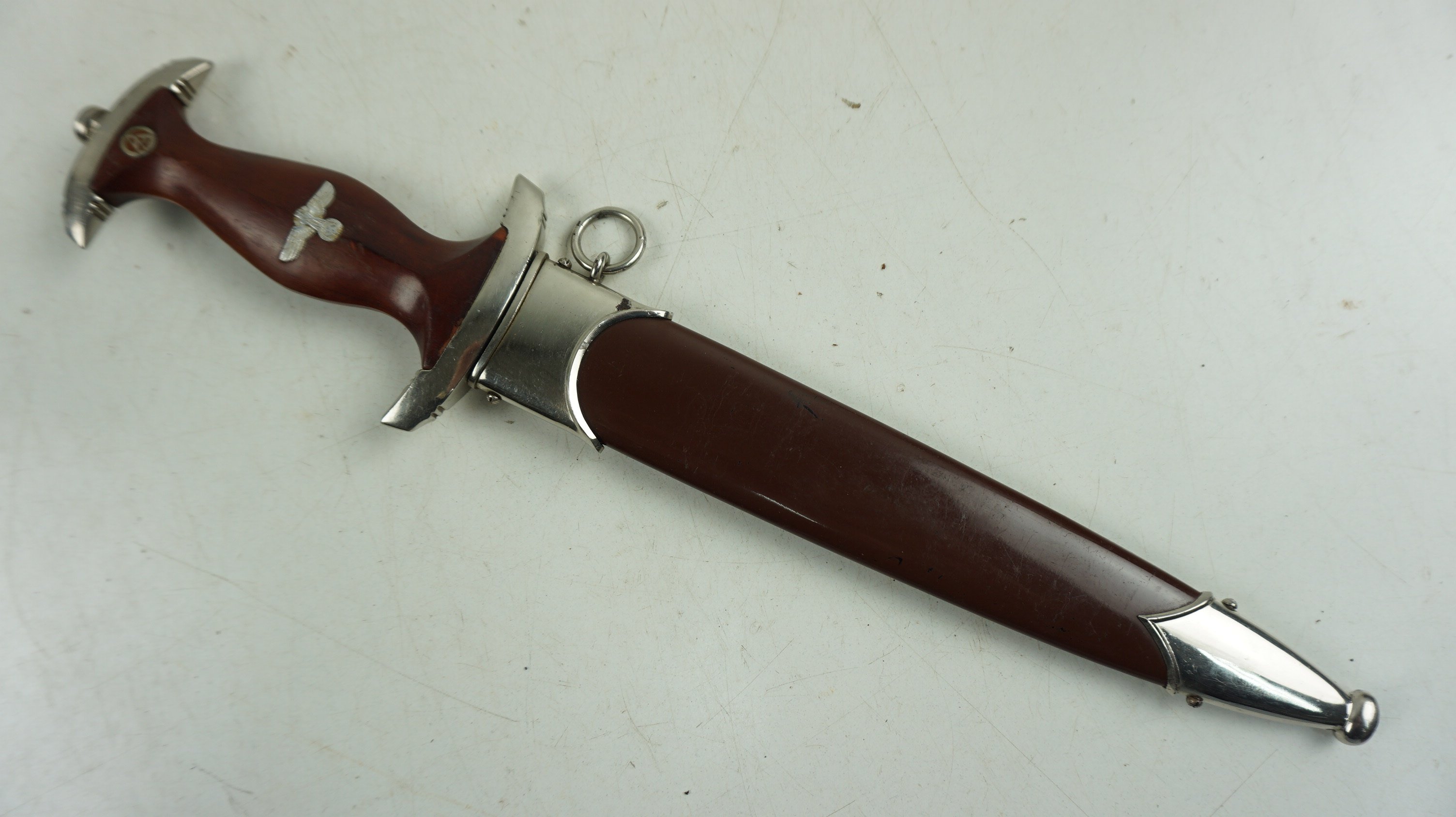 SA DRESS DAGGER By RZM M7/10 1941SA 'Sturmabteilung' Dress Dagger. Double edged, bright blade with acid etched motto 'Alles Fur Deutschland' in light grey background. Maker marked 'RZM M7/10 1941' (J.A. Henckels). Chrome plated crossguards. Aluminum reichsadler and SA enamel button. Brown painted steel scabbard with chromed fittings. Blade Length: 8 3/4' Total Length: 13 5/8' In very good condition.