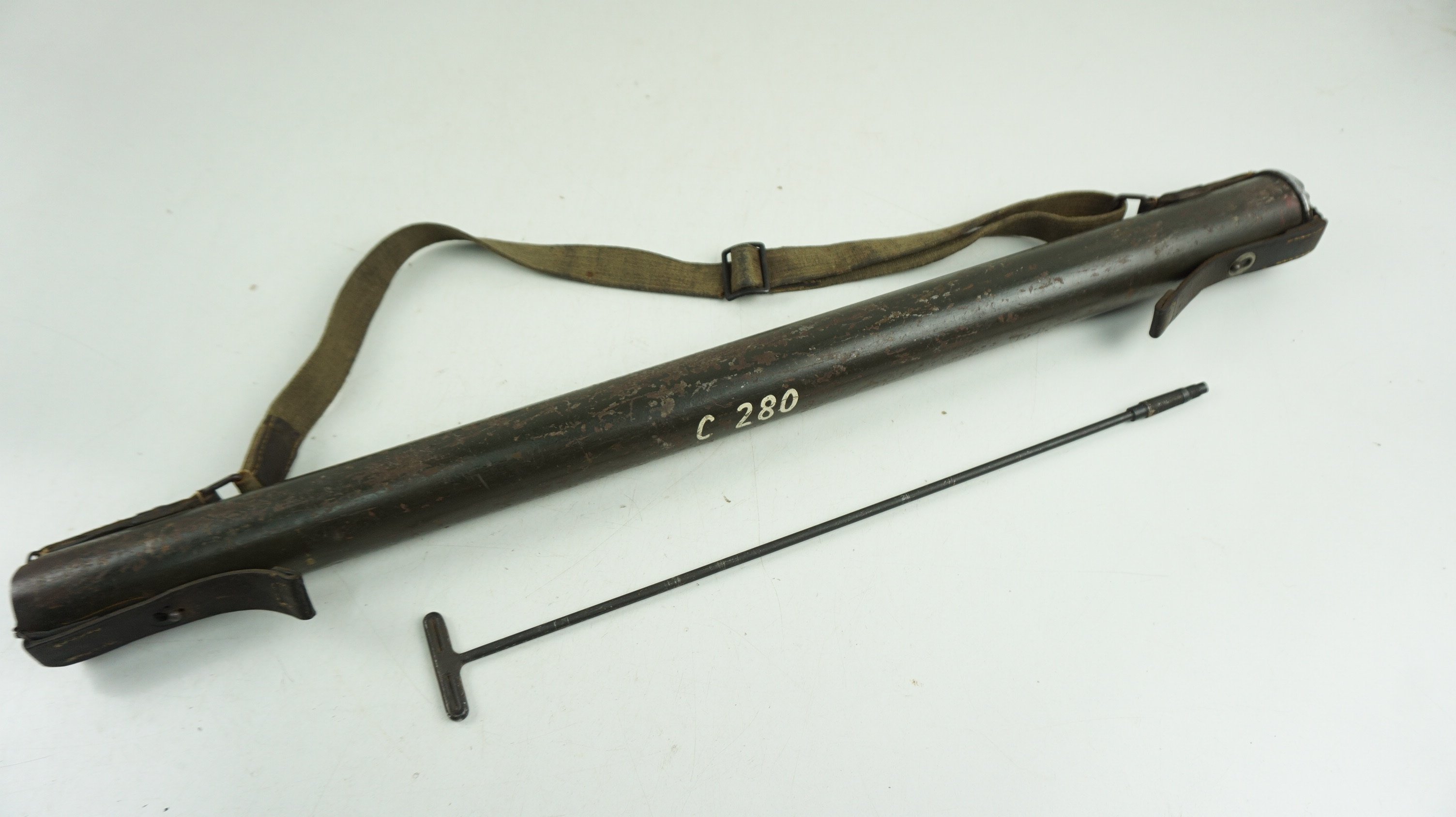 MG13 barrel container (Laufschützer). Container for a barrel, complete with carrying strap and a cleaning rod. The container is nicely marked with the number 'C 280' stenciled in white. Nice original set in good used condition!
