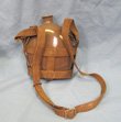 Original era manufacture. Standard pattern Army canteen but of brown enameled steel without the cork stopper. Green canvas harness with faint issue stamps on the inside of the strap, now darkened from age and use. Typical scattered chipping to the canteen surface, shoulder strap and harness are sound.