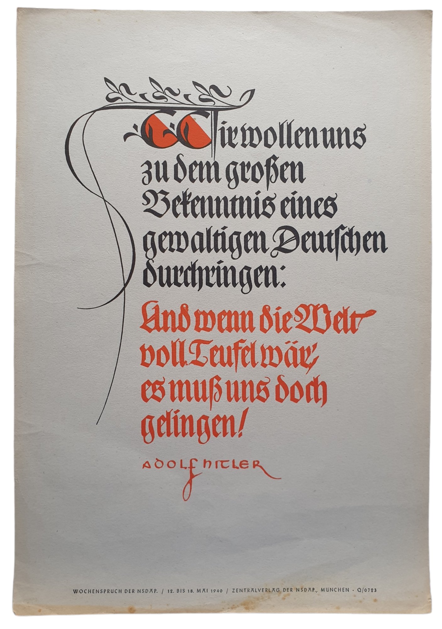 NSDAP Wochenspruch May 1940 by Adolf Hitler.''Wir wollen uns zu dem grossen Bekenntnis eines gewaltigen Deutschen durchringen: Und wenn die Welt voll Teufel waer; es muss uns doch gelingen!''35 x 24 cmNSDAP Wochenspruch Mei 1940 door Adolf Hitler.''Wir wollen uns zu dem grossen Bekenntnis eines gewaltigen Deutschen durchringen: Und wenn die Welt voll Teufel waer; es muss uns doch gelingen!''35 x 24 cmProductnummer: 0040414