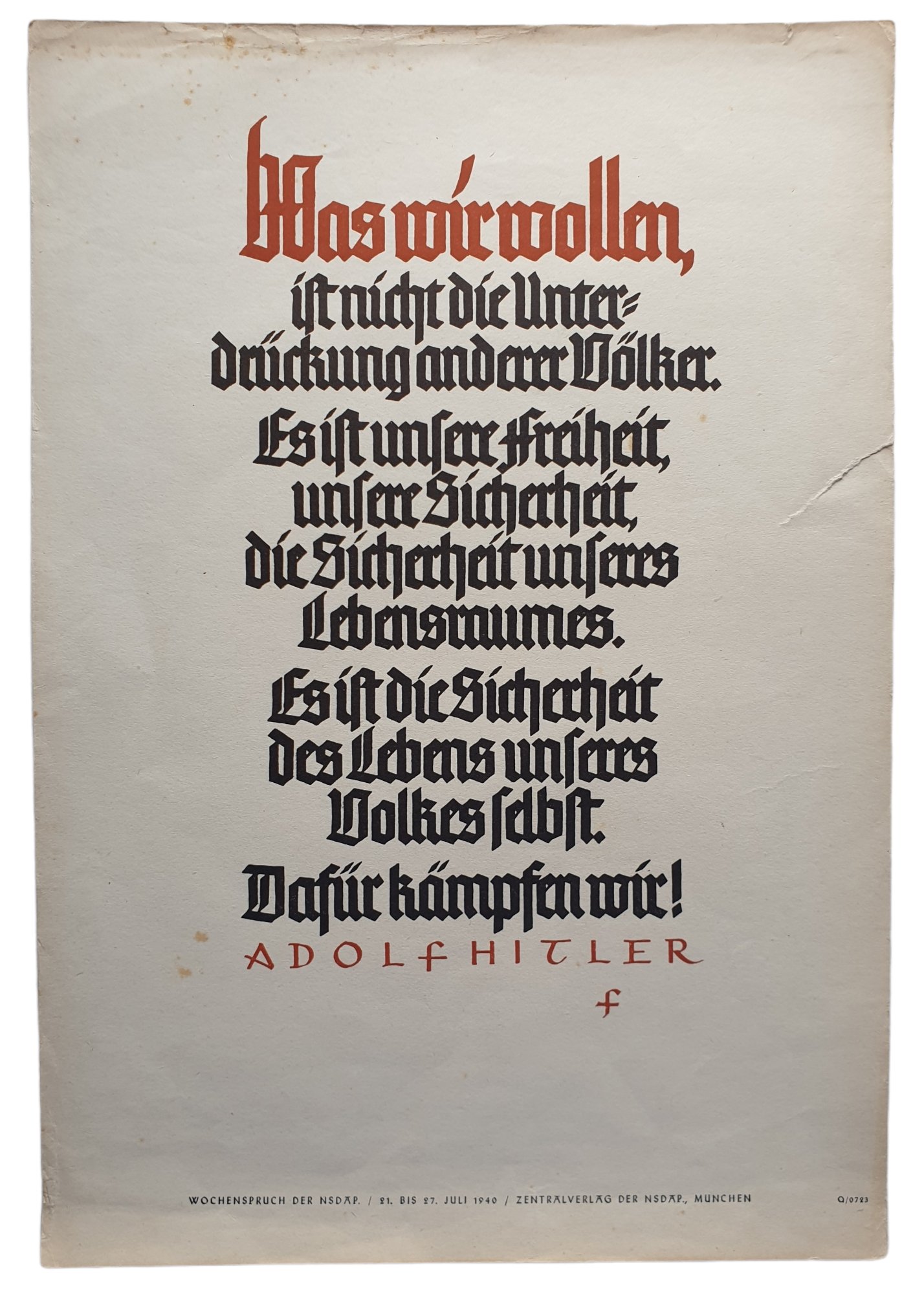 NSDAP Wochenspruch July 1940 by Adolf Hitler.''Was wir wollen, ist nicht die Unterdruckung anderer Volker. Es ist unsere Freiheit, unsere Sicherheit, die Sicherheit unseres lebensraumes. Es ist die sicherheit das lebens unseres volkes selbst. Darfur kampfen wir!''35 x 24 cmNSDAP Wochenspruch juli 1940 door Adolf Hitler.''Was wir wollen, ist nicht die Unterdruckung anderer Volker. Es ist unsere Freiheit, unsere Sicherheit, die Sicherheit unseres lebensraumes. Es ist die sicherheit das lebens unseres volkes selbst. Darfur kampfen wir!''35 x 24 cmProductnummer: 0040423