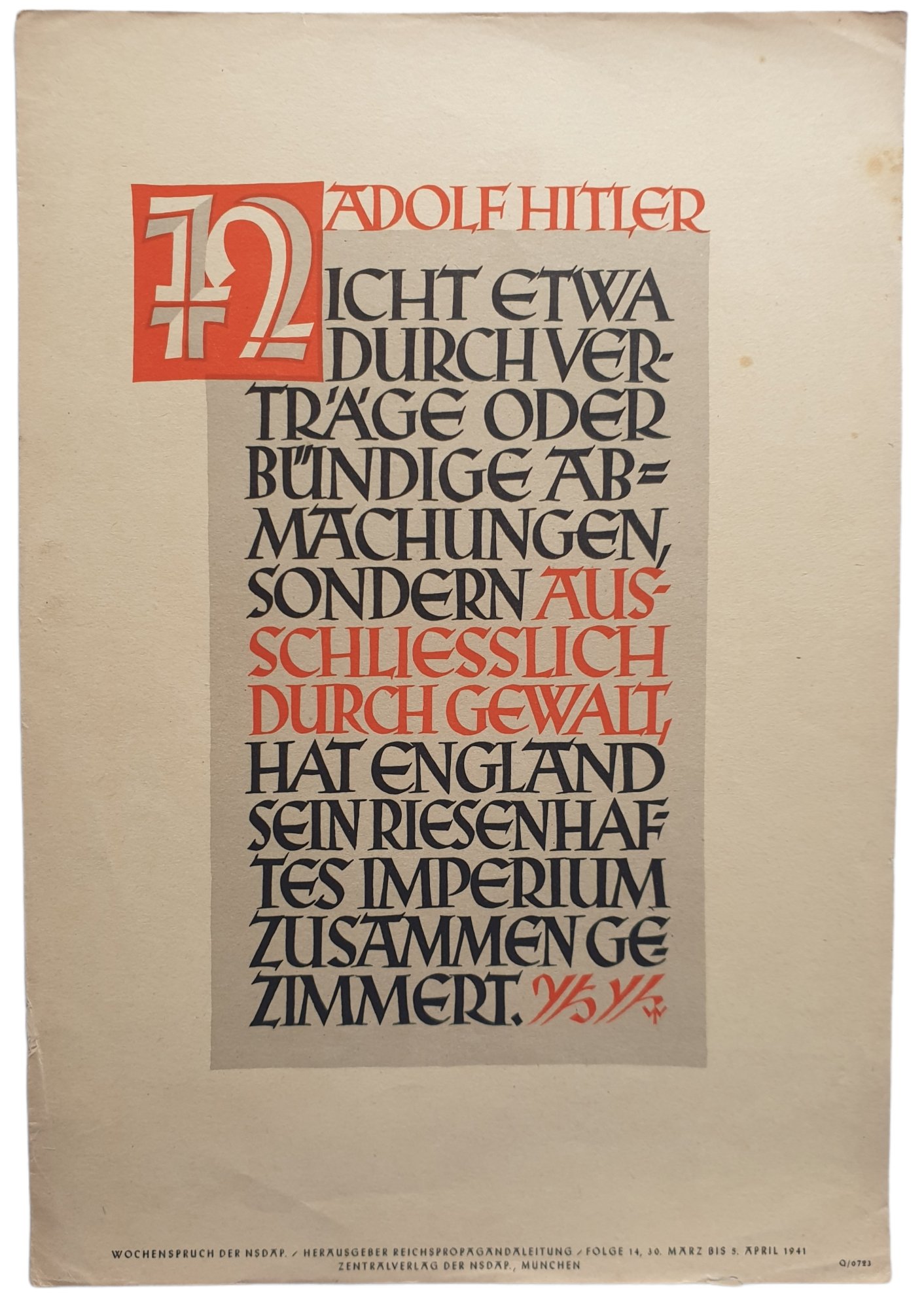 NSDAP Wochenspruch 1942 folge 14 by Adolf Hitler.''Nicht etwa durch vertrage oder bundige abmachungen sondern ausschliesslich durch gewalt, had England sein reisenhaftes imperium zusammen gezimmert.''35 x 24 cmNSDAP Wochenspruch 1942 folge 14 door Adolf Hitler.''Nicht etwa durch vertrage oder bundige abmachungen sondern ausschliesslich durch gewalt, had England sein reisenhaftes imperium zusammen gezimmert.''35 x 24 cmProductnummer: 0040424