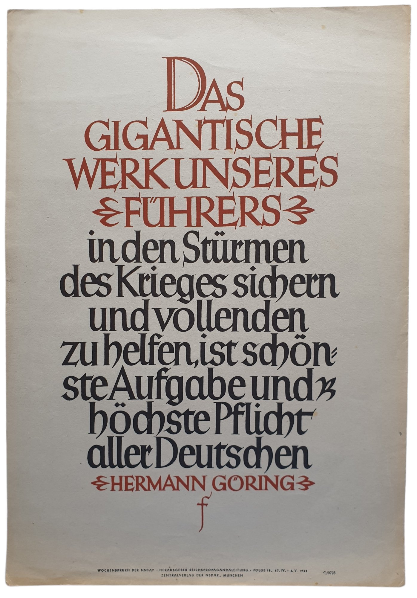 NSDAP Wochenspruch 1942 folge 18 by Herman Goring.''Das gigantische werk unseres Fuhrers in den sturmen des krieges sichern und vollenden zu helfen, ist schonste aufgabe und hochste plflicht aller Deutschen.''35 x 24 cmNSDAP Wochenspruch 1942 folge 18 door Herman Goring.''Das gigantische werk unseres Fuhrers in den sturmen des krieges sichern und vollenden zu helfen, ist schonste aufgabe und hochste plflicht aller Deutschen.''35 x 24 cmProductnummer: 0040425
