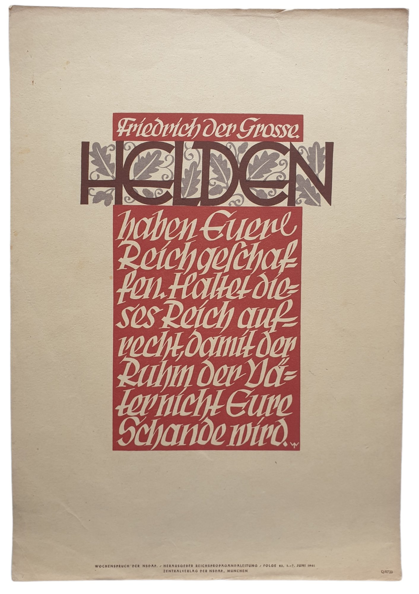 NSDAP Wochenspruch 1942 folge 23 byFrederick the Great.''Helden haben Euer Reich geschaffen. Haltet dieses Reich aufrecht, damit der Ruhm der Vater nicht eure schande wird.''35 x 24 cmNSDAP Wochenspruch 1942 folge 23 byFrederick the Great.''Helden haben Euer Reich geschaffen. Haltet dieses Reich aufrecht, damit der Ruhm der Vater nicht eure schande wird.''35 x 24 cmProductnummer: 0040426